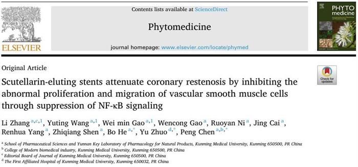 近日,国际知名学术期刊Phytomedicine(中科院医学1区TOP,IF=8.3)在线发表了题为“Scutellarin-eluting stents attenuate coronary restenosis by inhibiting the abnormal proliferation and migration of vascular smooth muscle cells throu