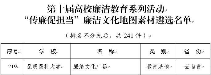 近日,教育部公布《第十届高校廉洁教育系列活动结果的通知》,昆明医科大学选送的3项作品入选。其中,“廉洁文化广场”教育基地