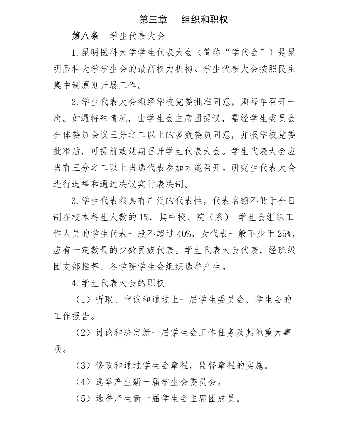 根据共青团中央办公厅、全国学联秘书处《普通高等学校学生会章程制定办法》《普通高等学校学生(研究生)代表大会工作规定》以及共青团中央、教育部、全国学联联合下发的《关于推动高校学生会深化改革的若干意见》的内容和要求,作了进一步修订,形成《昆明医科大学学生会章程》。