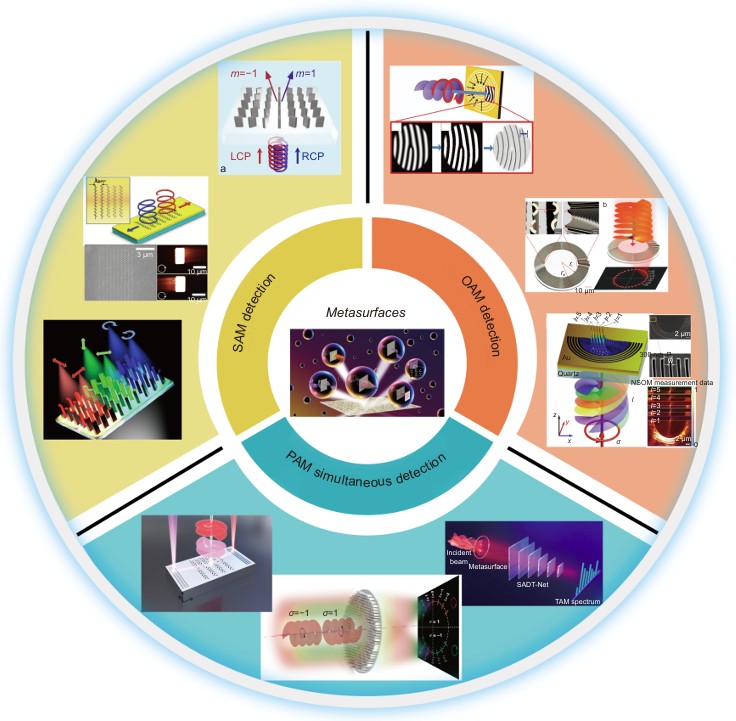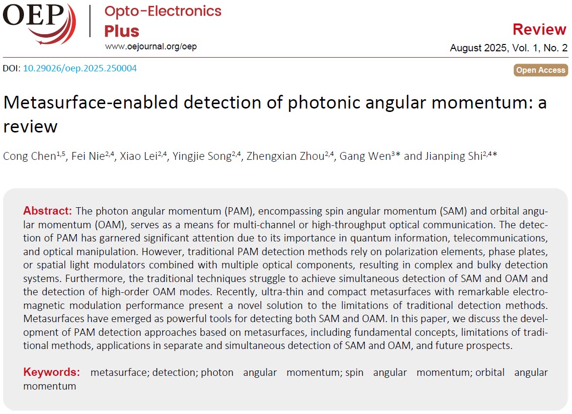 近日,昆明医科大学生物医学工程研究院文刚副研究员团队联合铜陵学院陈聪团队与安徽师范大学石建平教授团队,应邀在光学领域新刊《Opto-Electronics Plus》上发表题为“Metasurface-Enabled Detection of Photonic Angular Momentum: A Review”的创刊综述文章。该论文系统回顾了基于超表面的光子角动量(Photon Angular Momentum, PAM)检测技术的最新进展,总结了当前领域面临的关键挑战,并对未来研究方向作出展望。
