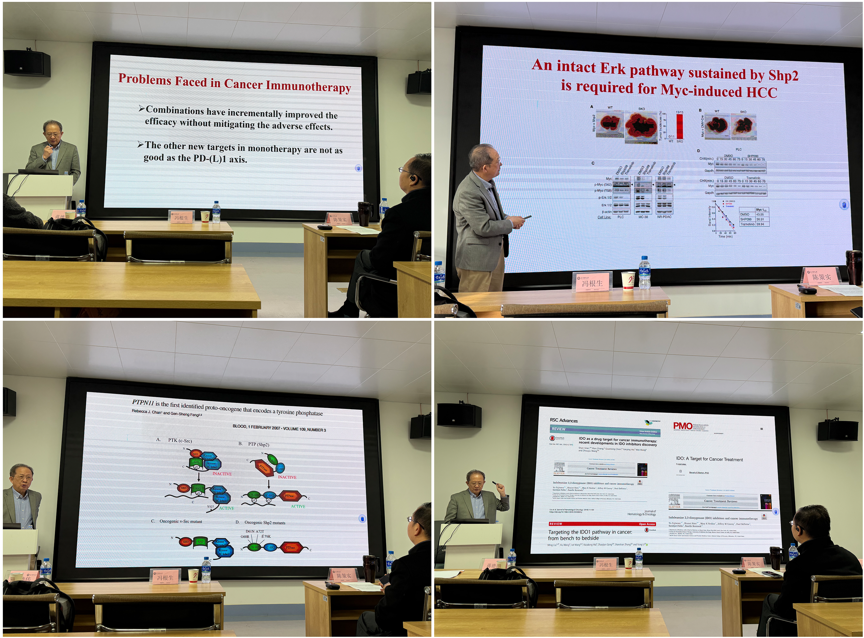 冯根生教授结合自己科研生涯,冯根生教授以“Mechanism and immunotherapy of liver cance”为题为题,结合其从博士阶段至今跨越三十余年的科研逻辑与成果转化历程,为师生们带来了一场学术盛宴。冯教授首先分享了其早期关于IFN-γ诱导IDO介导色氨酸降解的研究,深入剖析了IDO1抑制剂在临床试验中遭遇挫败的深层机理:他指出IDO抑制在强化T细胞免疫反应的同时,可能诱发肿瘤细胞对IFN-γ产生抗性,这一“科研悖论”为当前免疫治疗的瓶颈提供了重要理论解释。随后,冯教授详细介绍了其克隆Shp2酪氨酸磷酸酶并证明其作为EGFR信号增强子的突破性工作,展示了Shp2抑制剂从基础发现到临床试验的转化之路。最后,针对PDL-1疗法的局限性,冯教授强调了开发能够规避代偿性免疫抑制、实现多途径精准协同的新一代免疫治疗策略的紧迫性,为肝癌的精准医疗提供了前瞻性的科研范式。