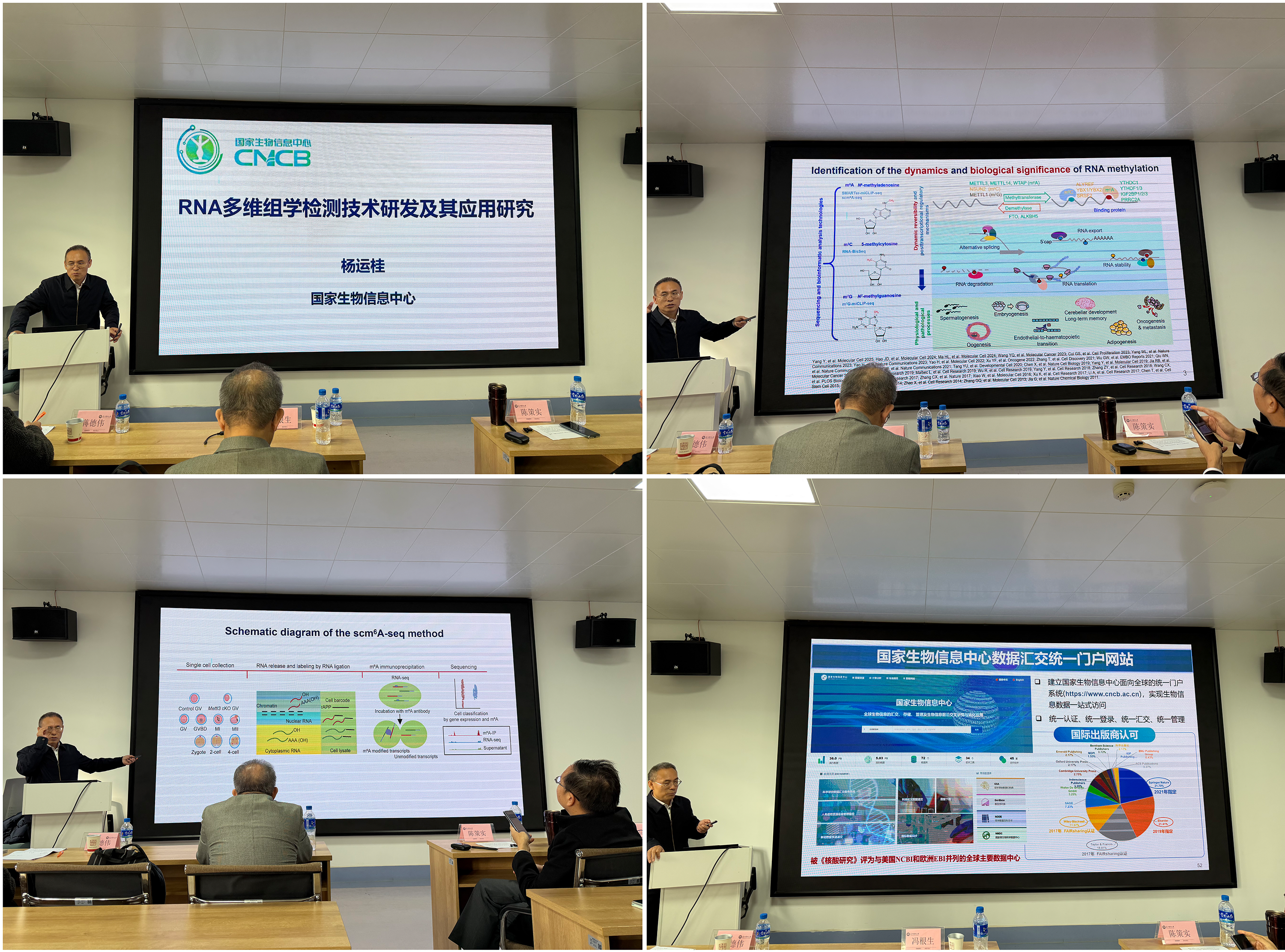 杨运桂研究员以“RNA多维组学检测技术研发及其应用研究”为主题,系统展示了其团队在RNA修饰与翻译调控领域的系列前沿成果。杨研究员重点介绍了团队自主研发的rCUP-seq和scm?A-seq等高灵敏度测序技术,这些技术实现了在全基因组及单细胞水平上对RNA结合蛋白和m?A修饰的精准定位。讲座从新技术开发到生物学机制解析,深度展现了表观转录组学在生命科学研究中的核心驱动作用。此外,杨主任还介绍了国家生物信息中心在数据资源与服务能力建设方面取得的显著成就,通过展示国家生物信息中心数据汇交统一门户网站,强调了生物医学大数据集成与共享对于推动国家生命科学研究高质量发展的重要支撑作用。