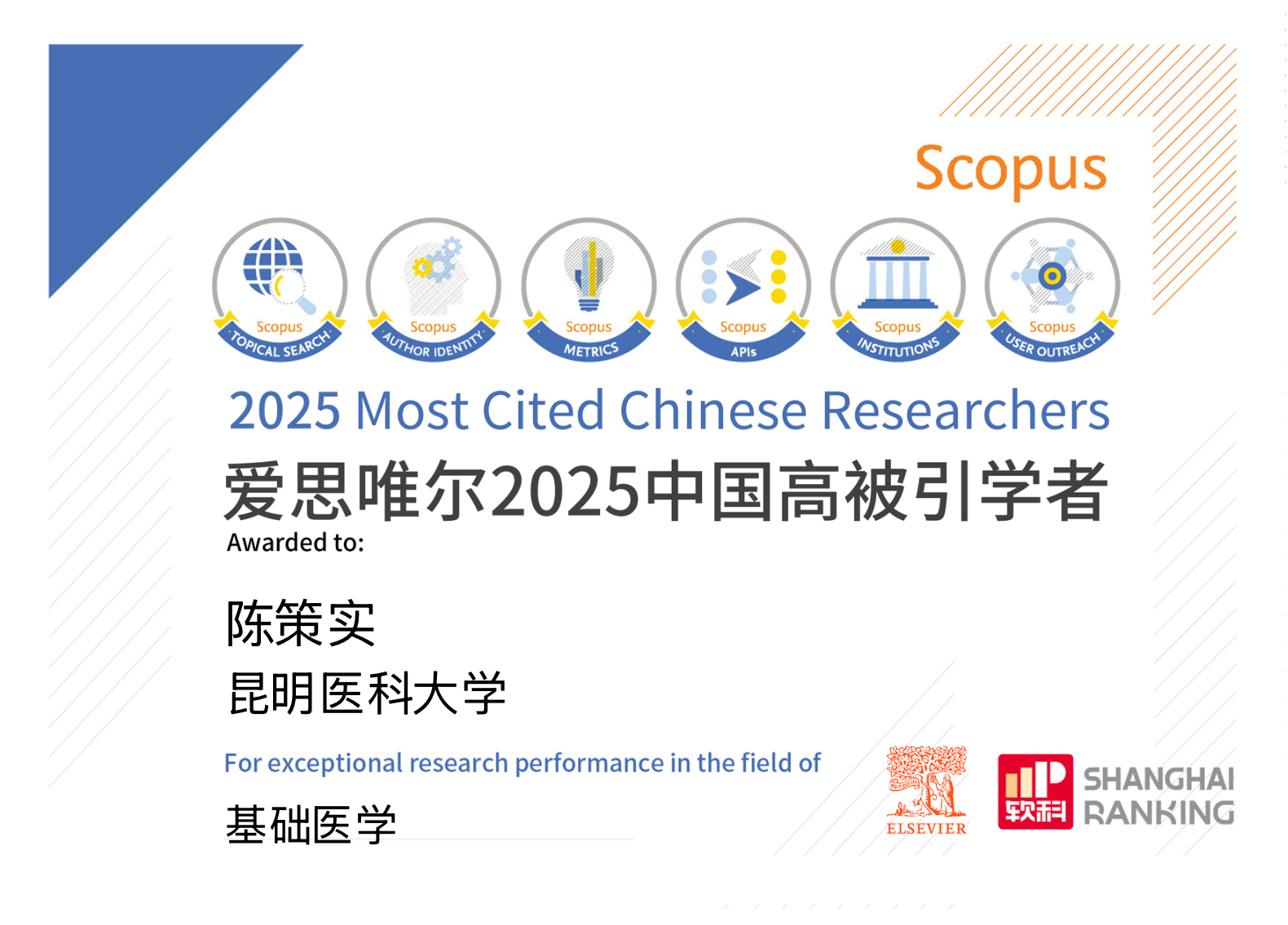 2025年“基础医学”学科共有来自中国机构的58个单位、125位学者上榜,其中,陈策实研究员是云南省唯一入选的基础医学领域学者。陈策实研究员已连续入选2022—2025年度“中国高被引学者”榜单,彰显了他在基础医学研究方面的学术贡献,也标志着昆明医科大学在基础医学领域科研实力和学术影响力的不断提升。