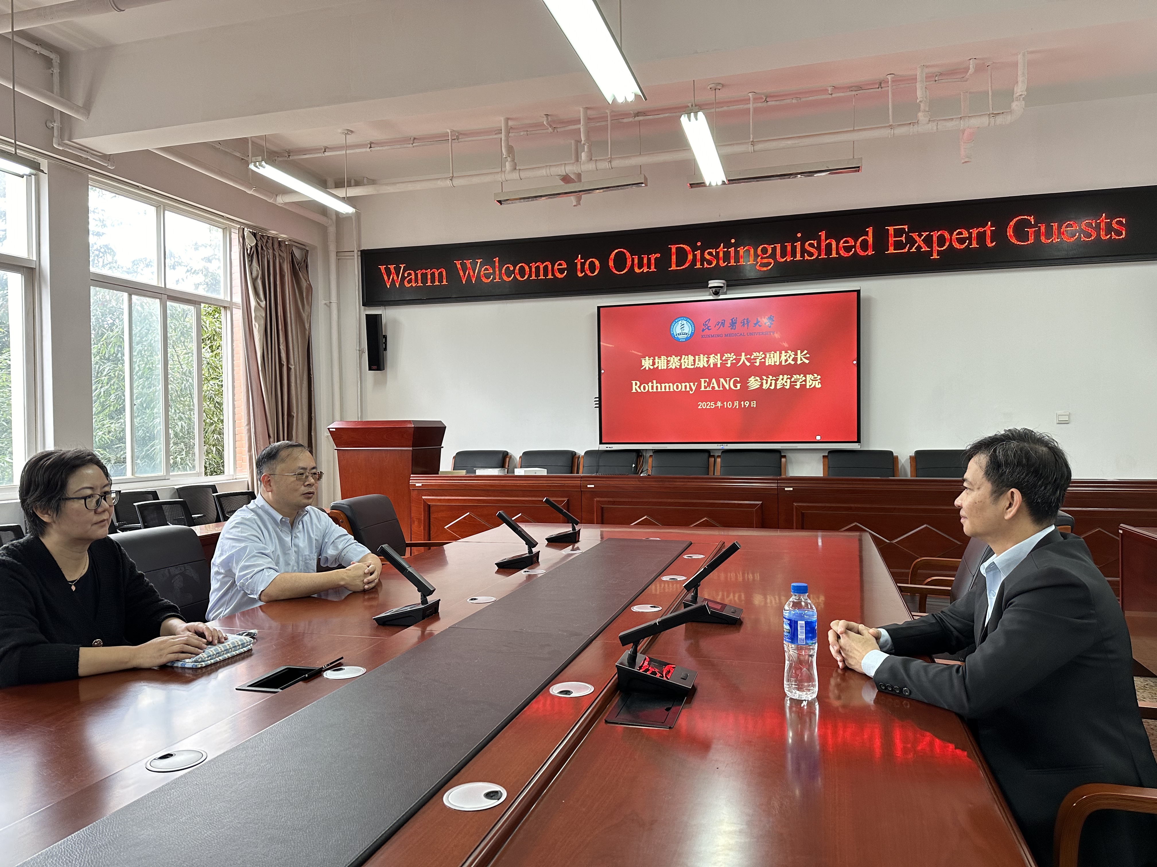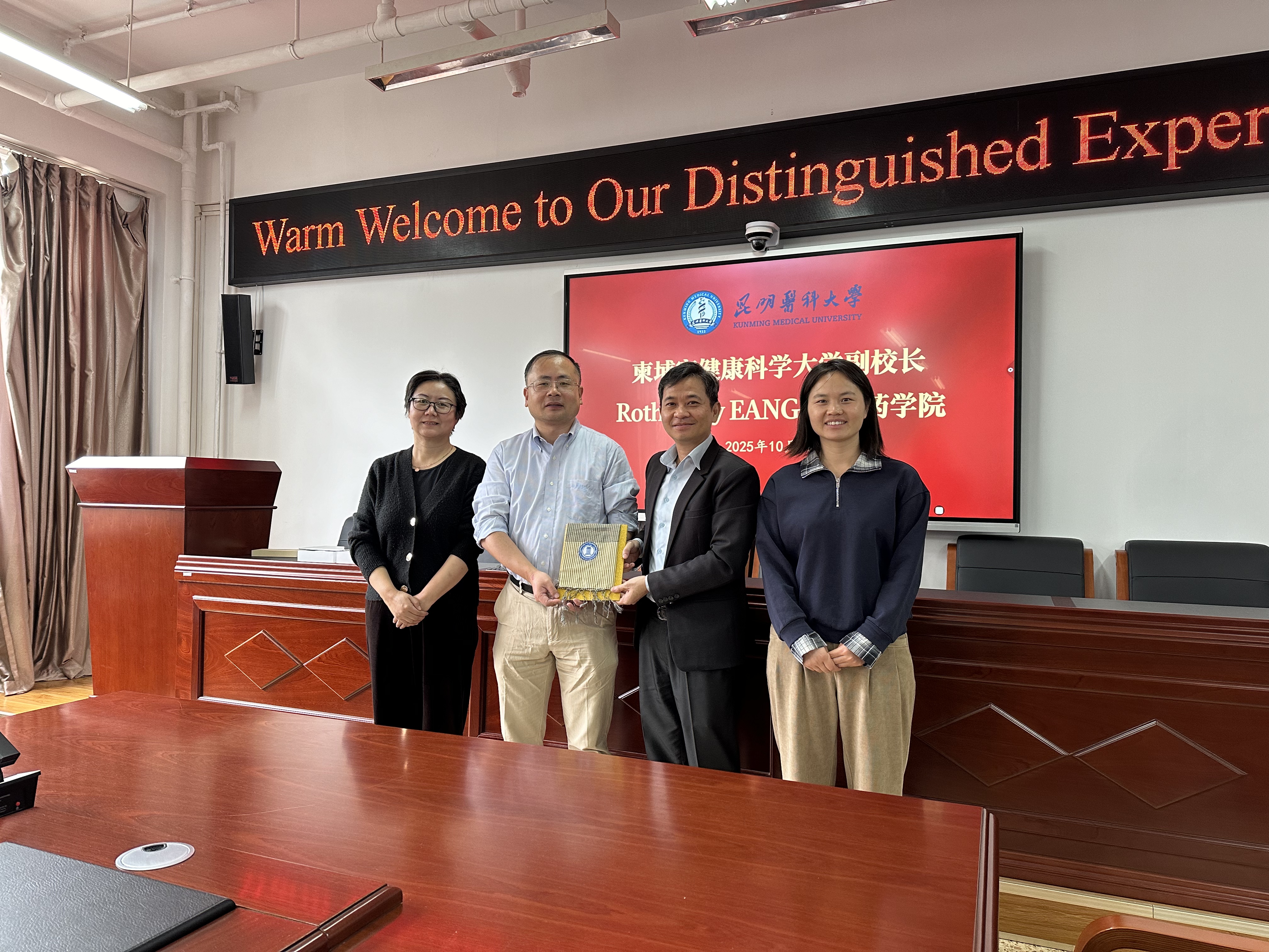 2025年10月19日,柬埔寨健康科学大学副校长Rothmony EANG教授访问昆明医科大学药学院(云南省现代生物医药产业学院)。药学院副院长(主持工作)兼云南省天然药物药理重点实验室主任郎靖瑜教授、云南省天然药物药理重点实验室办公室主任周轶平教授、外事秘书田晓雪博士进行了接待。