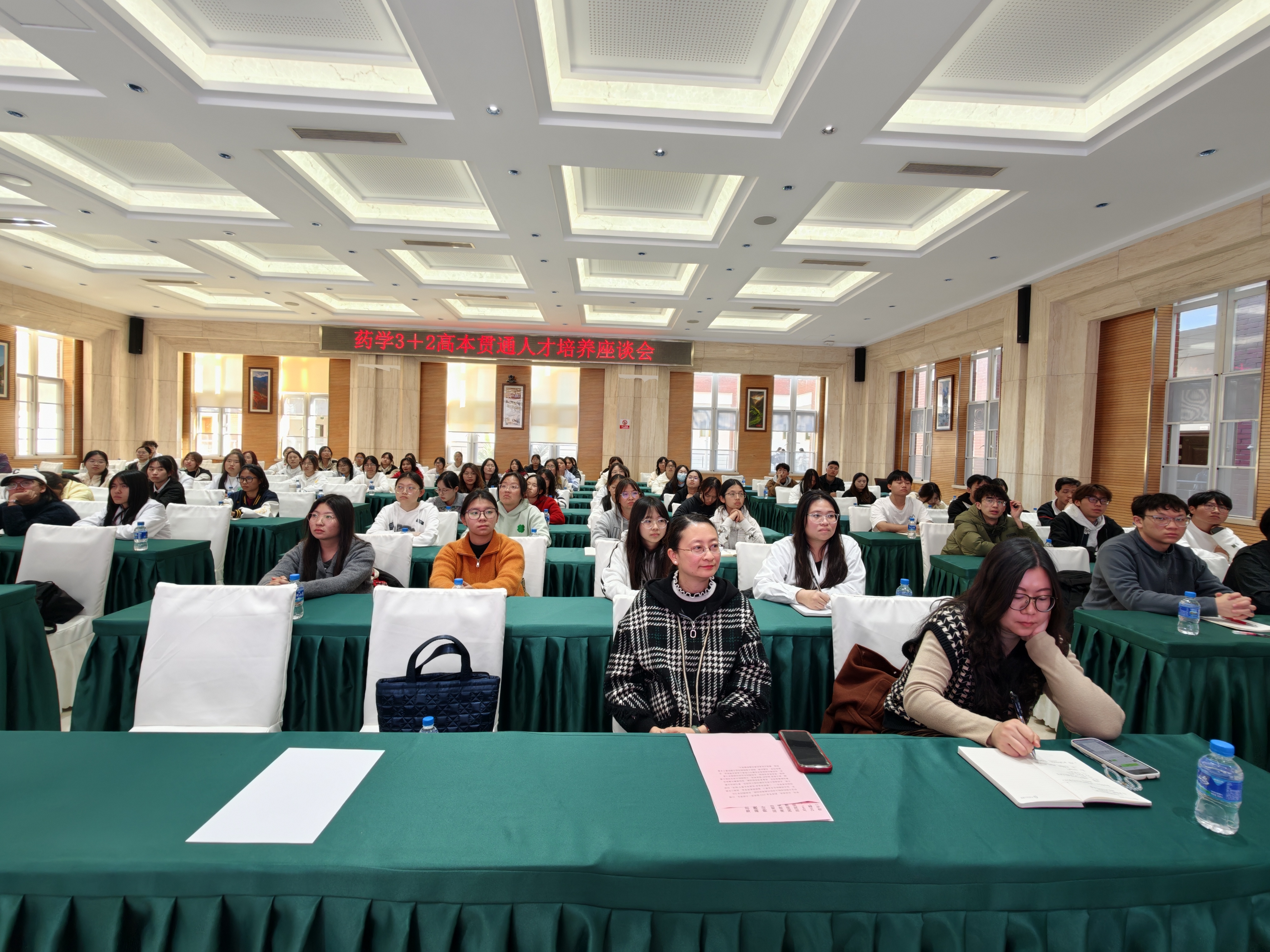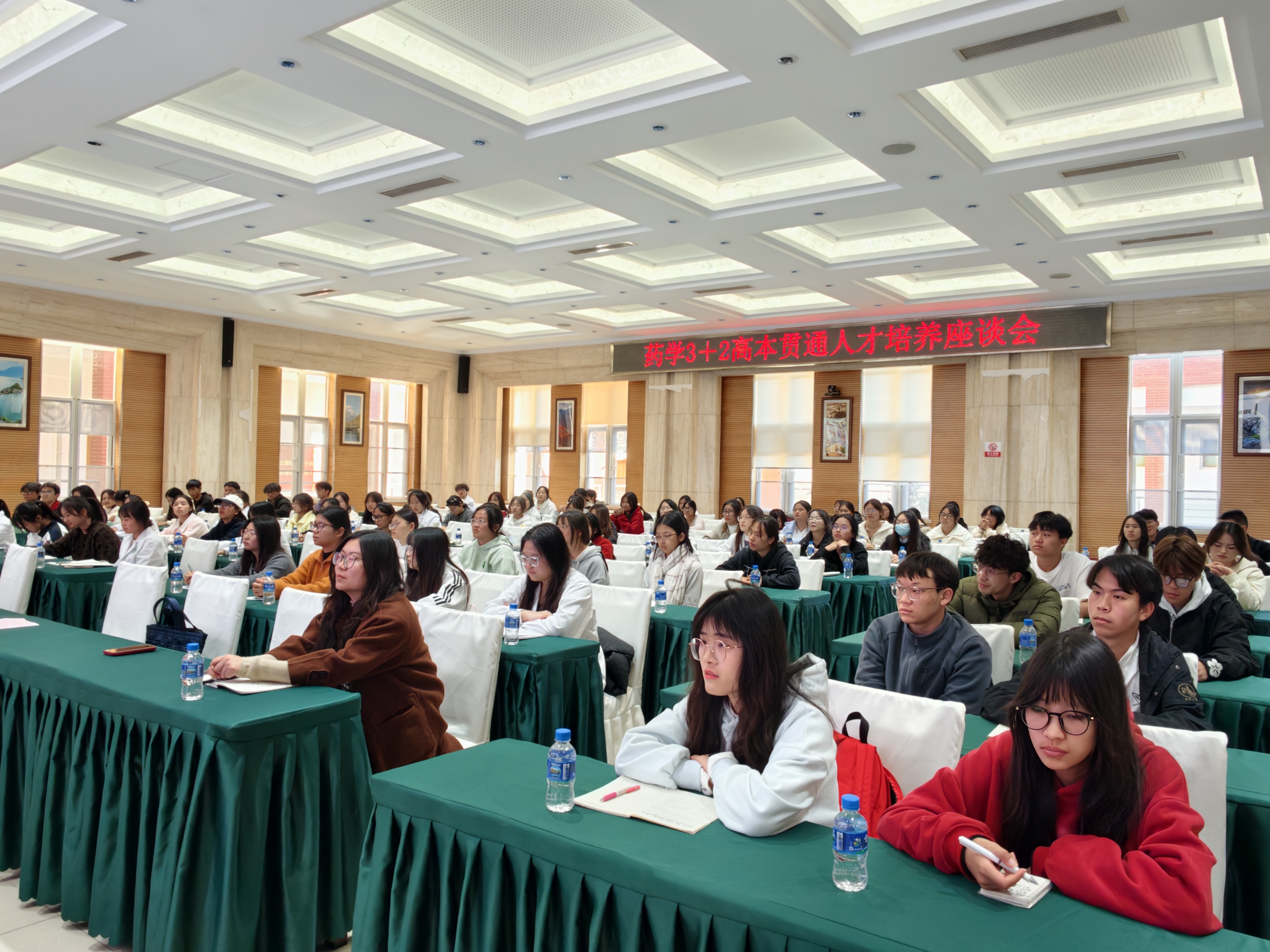 座谈会还开展了专题讲座与经验分享。陆露系统讲解了药学专业人才培养方案、课程体系设置及本科阶段学习的重点;药学院郑昌博副教授以《病毒感染与心血管损伤》为题进行了药学领域科学发展前沿动态的专题讲座分享。此外,药学院保研本科生李鸣分享了个人学习经验,为3+2高本贯通培养的学生们提供了实用参考。整场座谈会中,同学们展现出高度的学习热情与积极的参与态度,现场交流氛围浓厚,为高本贯通人才培养工作的深入推进奠定了良好基础。