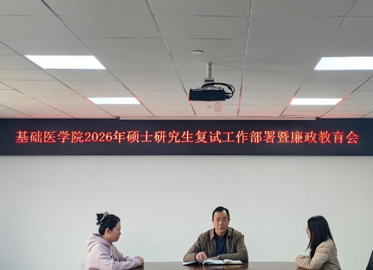 根据《昆明医科大学2026年硕士研究生招生考试复试录取工作办法》,切实做好基础医学院2026年硕士研究生复试录取各项工作,确保公平公正、科学规范,结合学院实际,2026年3月24日,学院召开2026年硕士研究生复试工作部署暨廉政教育会。会议由李盛安副院长主持,学院党政领导、招生工作领导小组成员、导师及全体考务人员参会。