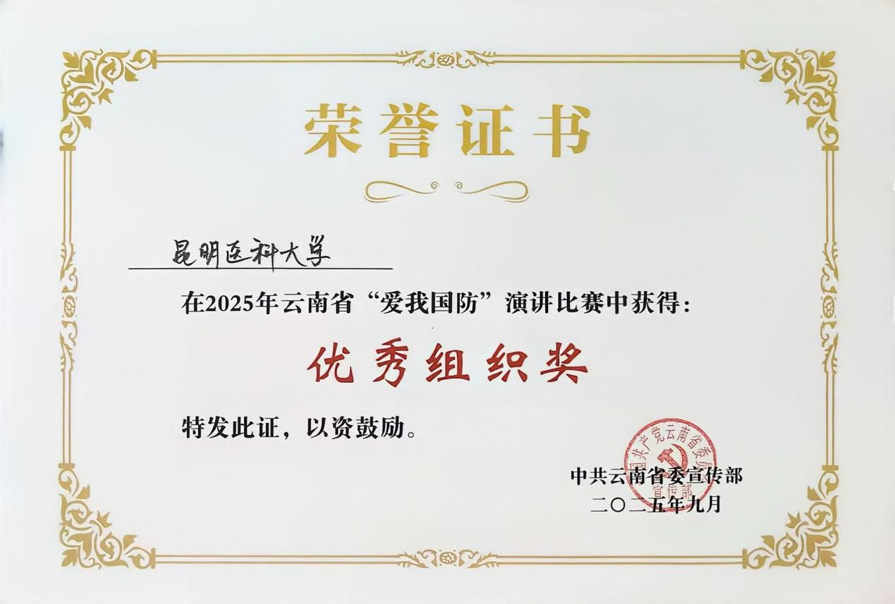 9月5日,由中共云南省委宣传部主办,中共云南省委省直机关工委、中共云南省委教育工委、云南省国资委协办的2025年云南省“爱我国防”演讲比赛决赛在昆明举办。昆明医科大学人文与管理学院马克楠同学获三等奖,学校获优秀组织奖。