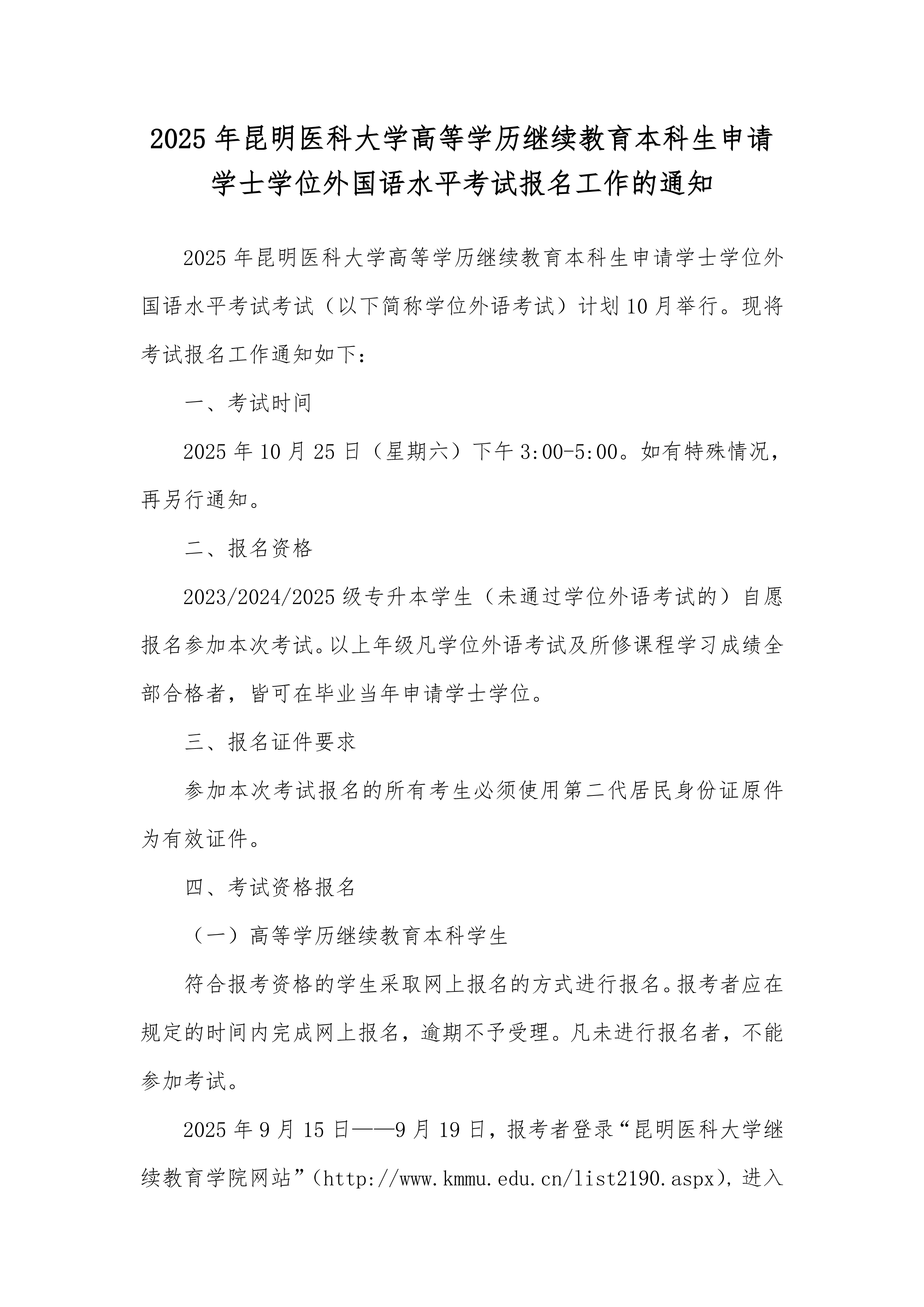 2025年昆明医科大学高等学历继续教育本科生申请学士学位外国语水平考试报名工作的通知