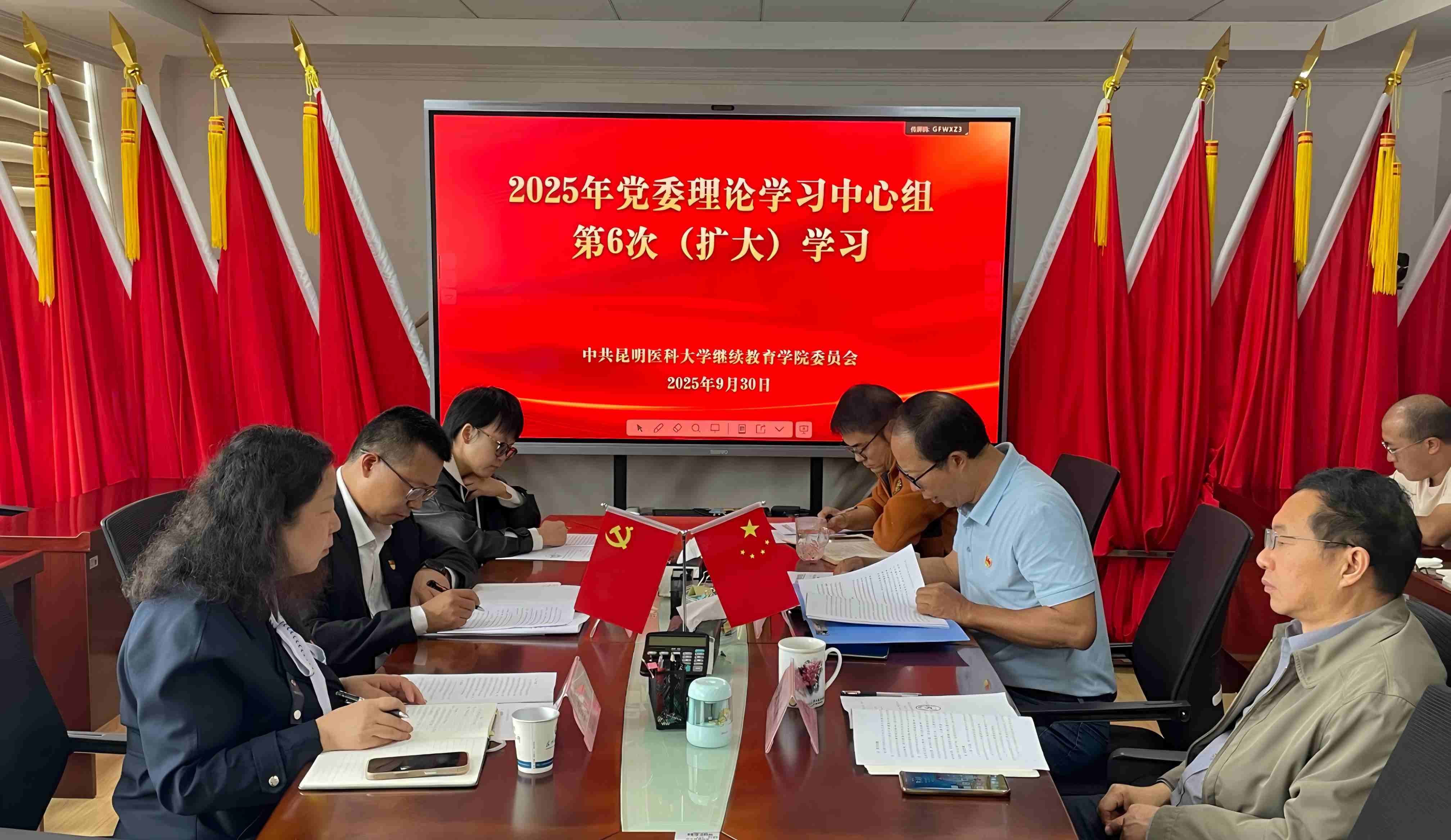 9 月 30 日,继续教育学院党委理论学习中心组开展 2025 年第六次(扩大)学习。本次学习深入研读习近平总书记关于加强党的作风建设的重要论述,专题学习习近平总书记关于锲而不舍落实中央八项规定精神、推进作风建设常态化长效化的重要讲话精神,深刻领会中央八项规定及其实施细则的核心要义;同时,组织学习贯彻习近平总书记9月3日在纪念中国人民抗日战争暨世界反法西斯战争胜利80 周年大会上的重要讲话精神,并围绕《关于加强新时代组织部门干部监督工作的意见》开展专题研讨。