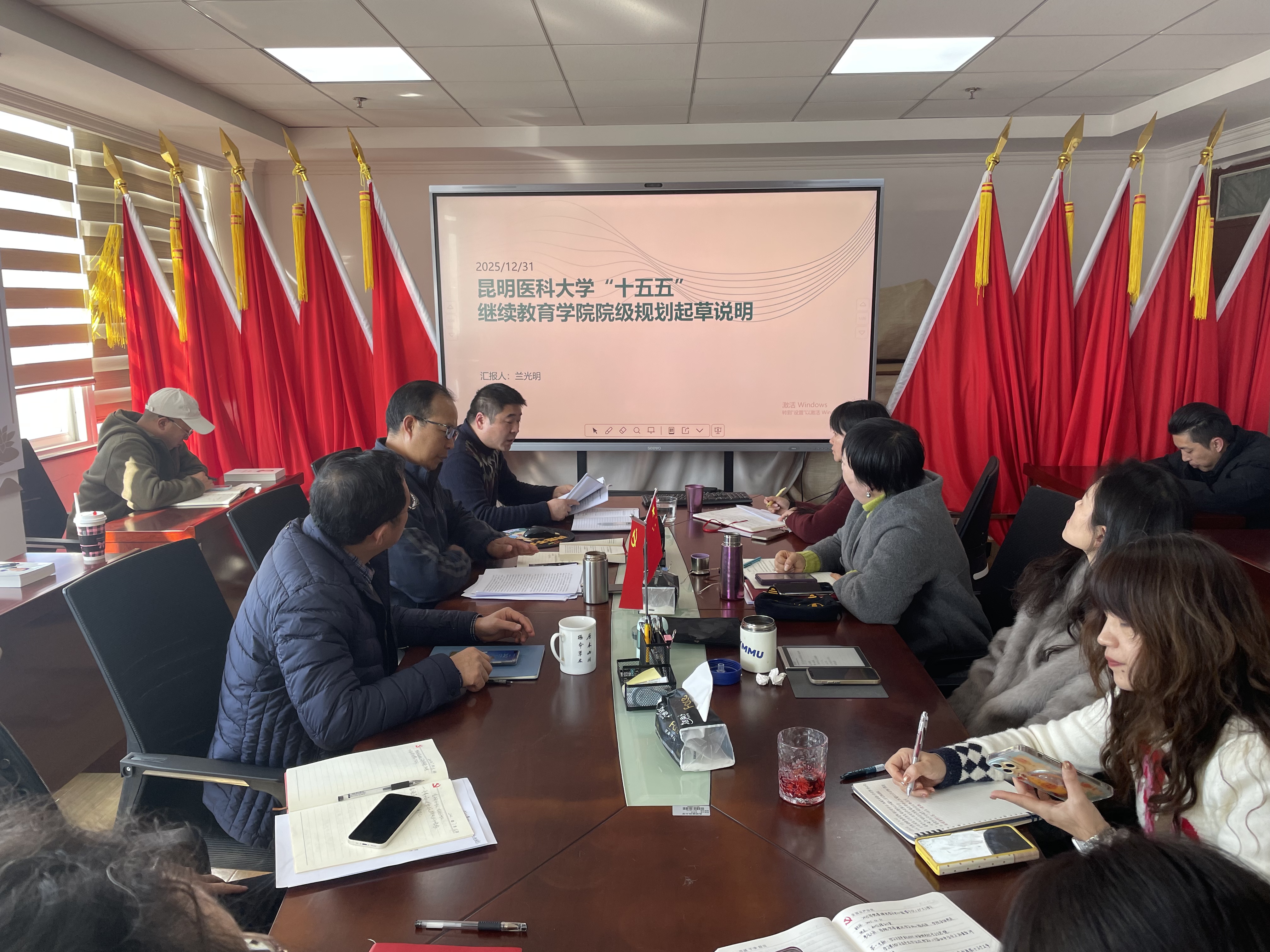 会上,全体参会人员集中学习了习近平总书记在党的二十届四中全会上的重要讲话精神,深入研读《中共中央关于制定国民经济和社会发展第十五个五年规划的建议》核心内容。兰光明围绕“昆明医科大学‘十五五’继续教育学院院级规划起草说明”作重点交流发言,从学院发展基础、当前形势研判、规划指导思想、定位与目标、主要任务举措及保障措施等关键维度展开系统阐述,同时对规划中的重点项目推进时序、责任分工细则及预期成效目标进行了具体说明,为规划落地提供了清晰路径。其他参会同志结合岗位职责与工作实际,围绕规划内容积极建言献策,就破解发展瓶颈、细化落实举措、强化协同联动等方面展开热烈研讨,凝聚了广泛思想共识与坚实行动合力。