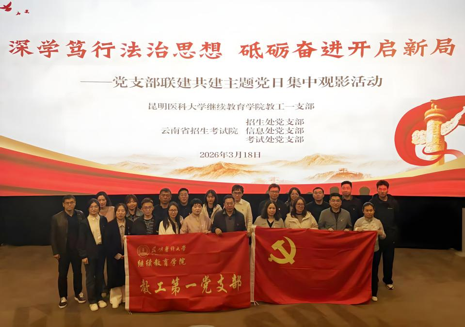 为深入学习贯彻习近平法治思想,弘扬社会主义法治精神,加强党支部之间的交流与合作,促进党建与业务深度融合,提升全体党员的法治观念,2026年3月18日下午,昆明医科大学继续教育学院教工第一党支部与云南省招生考试院招生处党支部、信息处党支部、考试处党支部联合开展“深学笃行法治思想 砥砺奋进开启新局”主题党日活动,集中观看法治教育影片《以法之名》,开展沉浸式法治教育与党性洗礼。