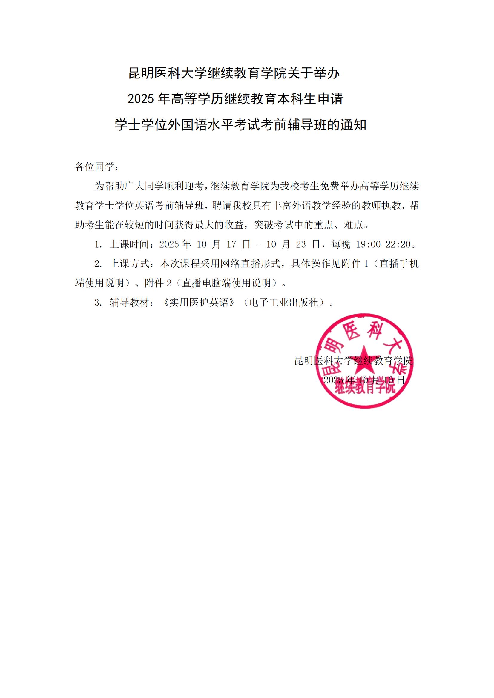 昆明医科大学继续教育学院关于举办2025年高等学历继续教育本科生申请学士学位外国语水平考试考前辅导班的通知