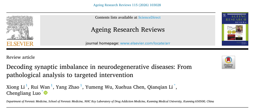 近日,昆明医科大学法医学院、国家卫生健康委员会毒品依赖和戒治重点实验室罗承良教授团队,以昆明医科大学为第一单位在知名期刊《Ageing Research Reviews》(中国科学院1区Top,IF=12.4)期刊发表了题为《Decoding synaptic imbalance in neurodegenerative diseases: From pathological analysis to targeted intervention》的综述论文。罗承良教授和李倩倩副教授为论文通讯作者,博士研究生李雄为论文第一作者,硕士研究生万锐和赵阳为论文共同第一作者。该研究工作得到国家自然科学基金、云南省科技厅基础研究计划重点项目资助。