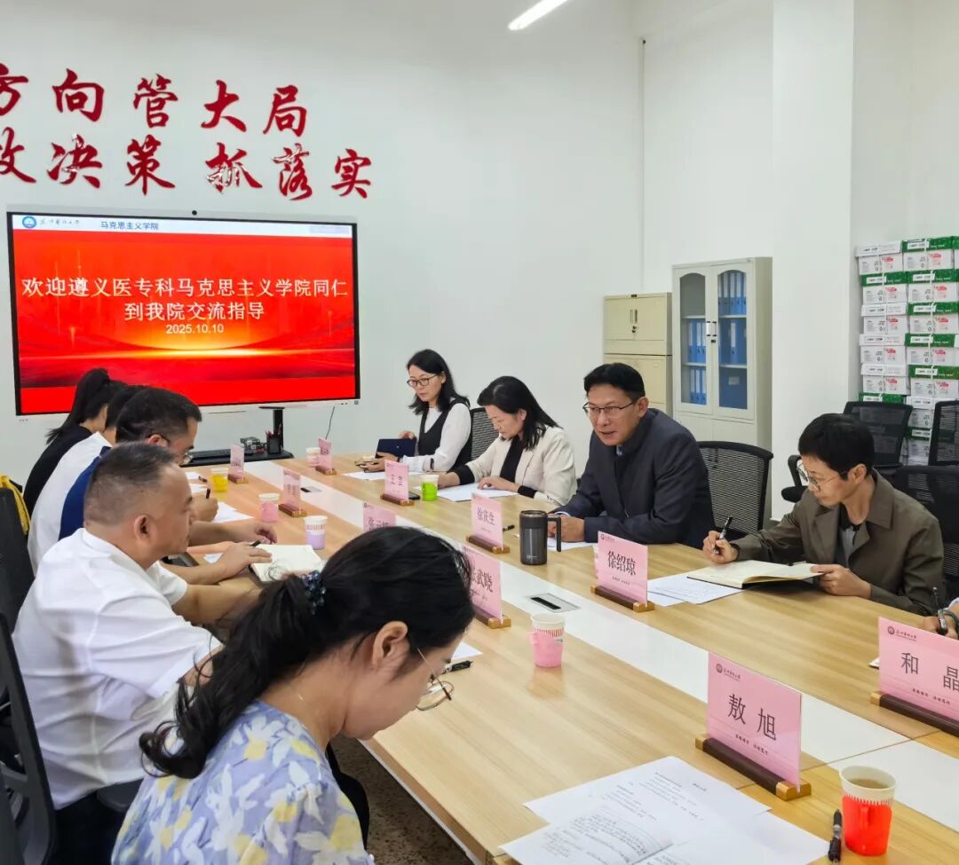 近日,遵义医药高等专科学校党委副书记张武晓、马克思主义学院党总支书记张云桥、副院长敖旭及各教研室主任一行7人到我院调研交流。学校党委副书记徐绍琼、学院党委书记兼院长徐庆生、学院党委副书记和晶、教学办主任代艳以及各教研室主任参加座谈。会议由徐庆生主持。