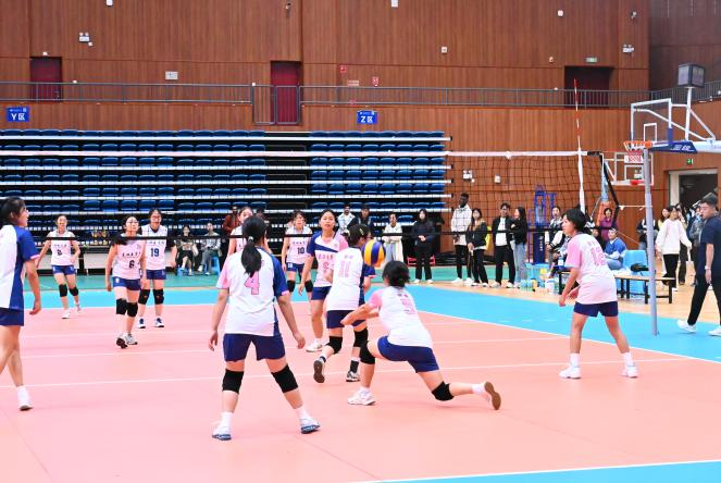 面对强劲的对手,公卫女排丝毫不退,接球跌倒也迅速起身,根据场上局势作出调整。