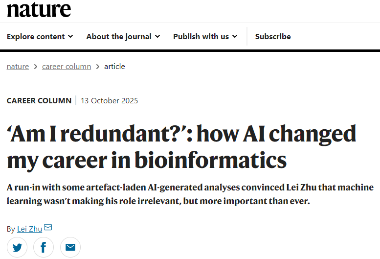 近日,国际顶级学术期刊《自然》(Nature)的“Careers”专栏发表了昆明医科大学第三附属医院教师朱磊署名文章。该文章以《‘Am I redundant?’:how AI changed my career in bioinformatics》为题,结合朱磊在生物信息学领域的工作经验,探讨了研究者有效使用和监督AI工具的方法和技巧。