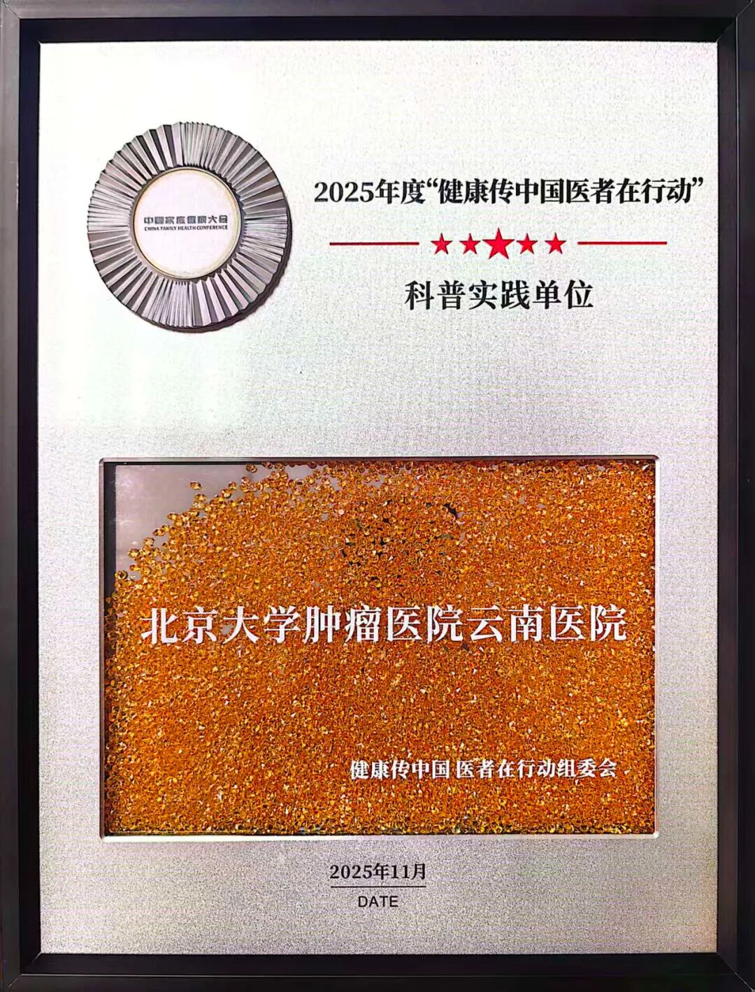 11月27日,2025年“强基赋能 共筑健康家庭”中国家庭健康大会在北京召开。北京大学肿瘤医院云南医院 云南省肿瘤医院 昆明医科大学第三附属医院被授予2025年“健康中国医者在行动”科普实践单位称号。