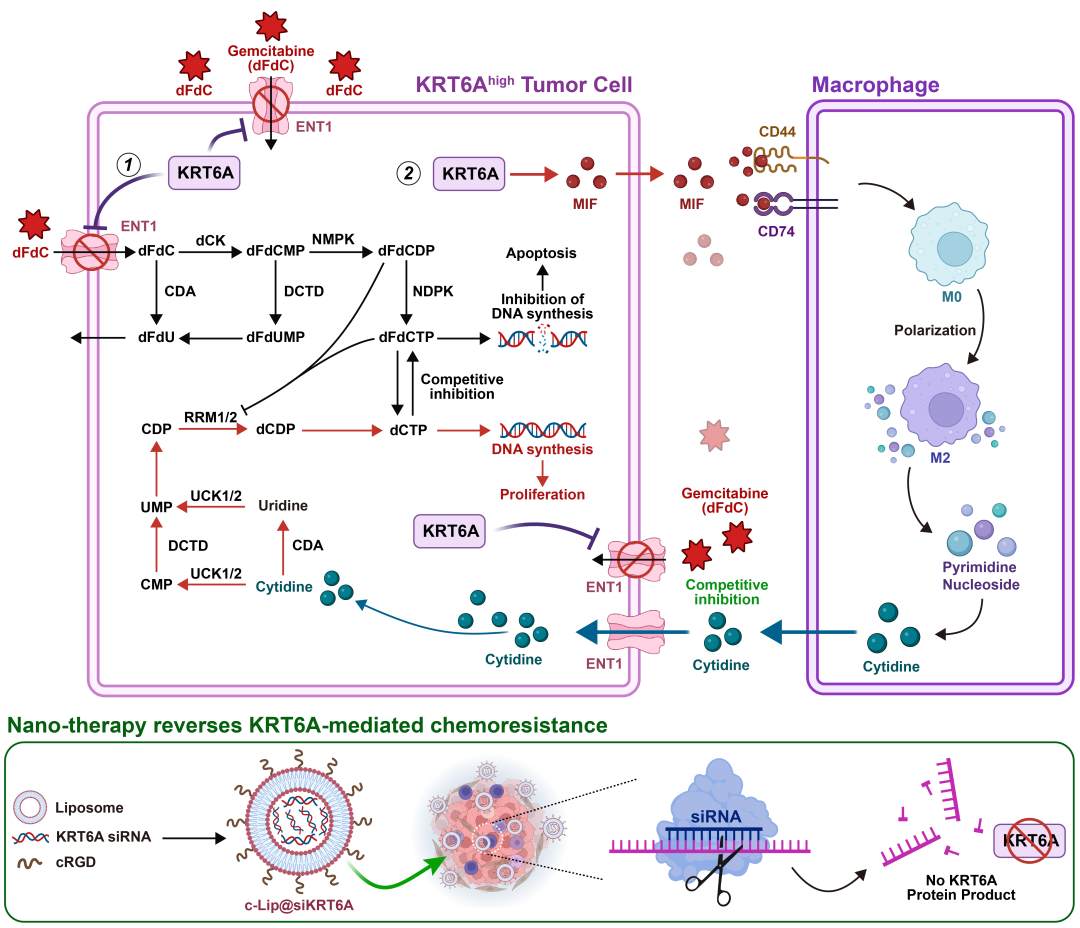 针对胰腺癌化疗耐受这一长期困扰临床的难题,研究从肿瘤细胞行为、免疫微环境变化及代谢适应机制等多个层面展开,明确角蛋白KRT6A在耐药形成中的关键作用。结果显示,KRT6A不仅通过抑制核苷转运蛋白ENT1表达减少药物摄取,还可调控肿瘤相关巨噬细胞状态,诱导免疫抑制性微环境,并形成以核苷代谢为特征的补偿通路,多层级共同参与耐药过程,为认识胰腺癌复杂耐药网络提供了新的视角。为此,团队围绕KRT6A这一关键靶点,设计并构建了相应纳米递送体系,实现对相关分子的精准调控。体内外实验表明,该策略可改善肿瘤免疫微环境,显著提升吉西他滨治疗效果,展现出良好的转化应用前景。