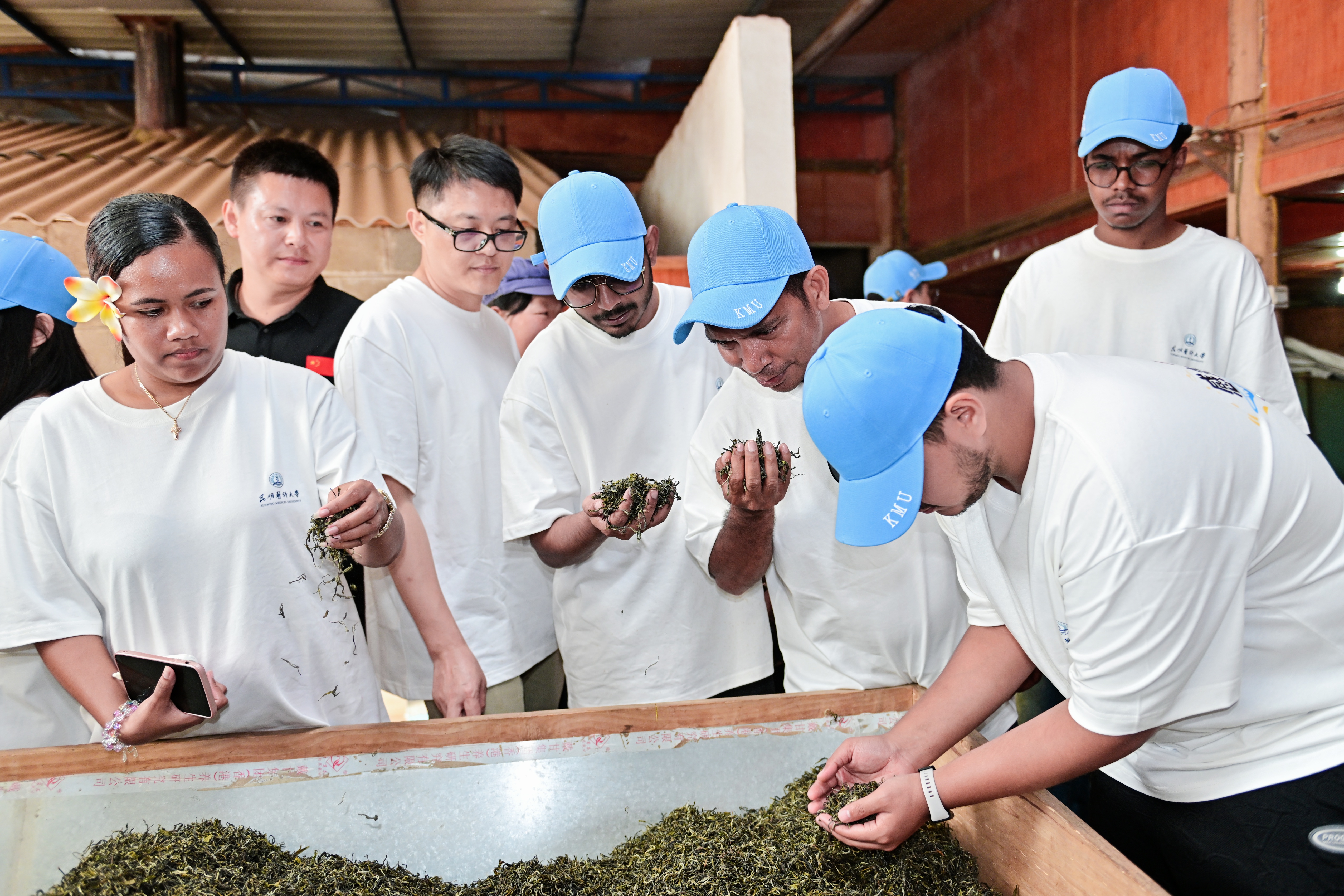 在昆明医科大学定点帮扶的保山市龙陵县象达镇,留学生们深入乡村产业一线,探寻特色产业助力乡村振兴的密码——“中国第九大仙草之一”的石斛。从象达镇石斛种植基地到昆明医科大学教育发展基金会资助建立的“仿野生石斛种植示范点”,再到龙陵县石斛花卉交易展示中心,留学生们学习了解了石斛的功效价值、生长习性、规范化种植技术、产品加工和推广交易,一条集种植、交易、研发、推广、科普于一体的完整产业链清晰地呈现给师生们。师生们参观象达三绿茶厂,在了解茶叶杀青、揉捻、烘烤、打包的完整生产流程中,感受传统茶文化与现代制茶工艺的融合。实践活动让留学生们深刻理解中国“生态优先、绿色发展”的乡村振兴理念,更清晰地看到特色产业对乡村经济发展、农民增收的带动作用,深入了解中国乡村振兴战略的实践路径。