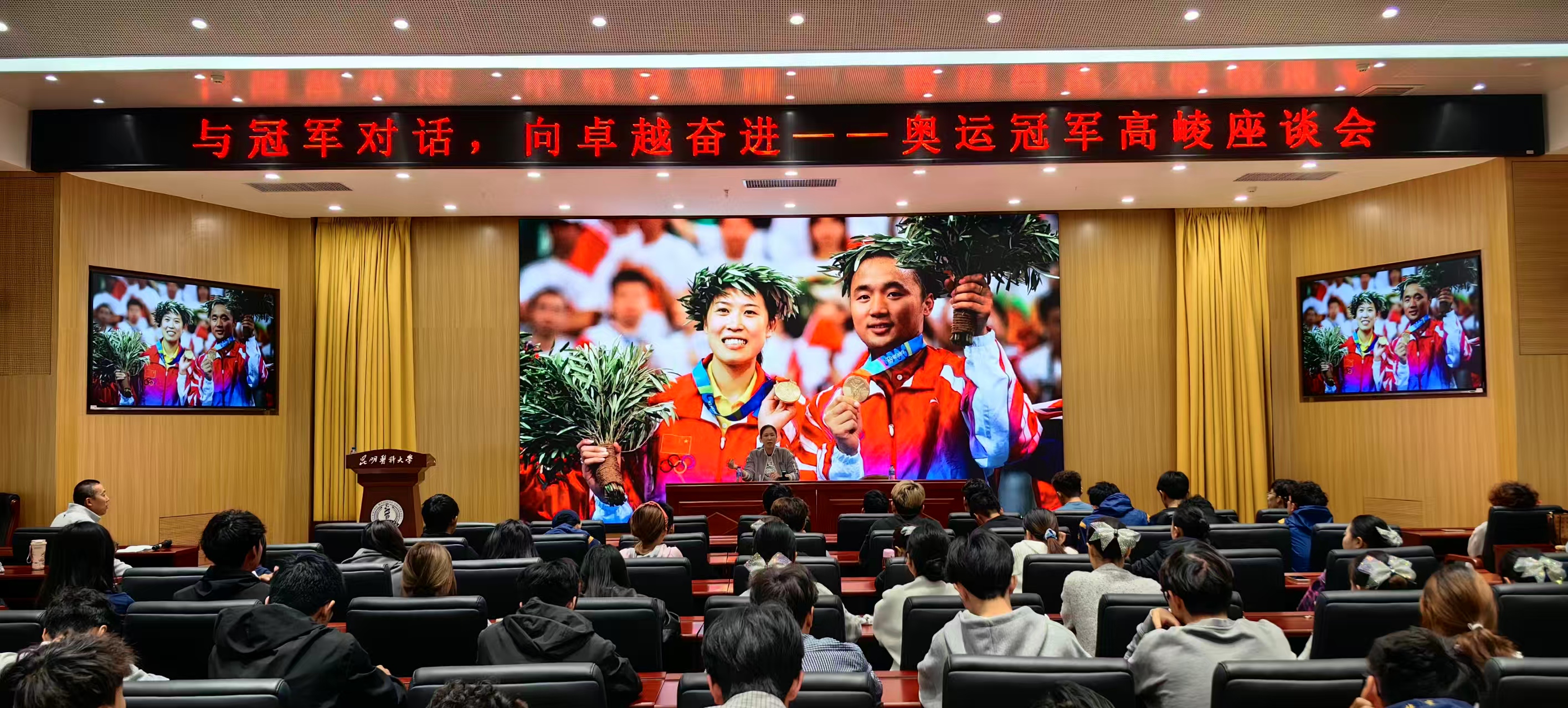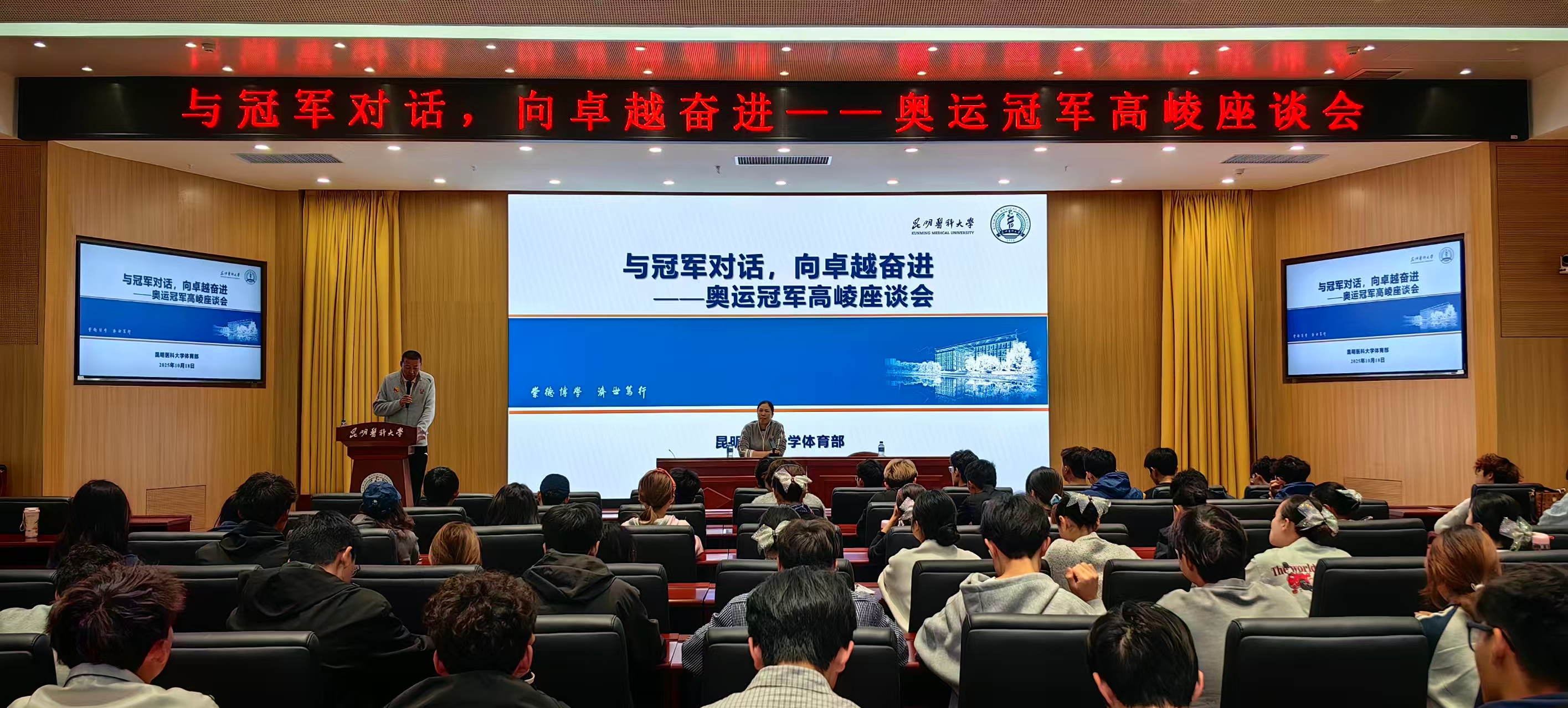 10月17日,中国羽毛球奥运冠军高崚应邀到昆明医科大学为学校运动代表队全体队员及2025级运动康复专业的同学们开展题为“与冠军对话,向卓越奋进”的座谈会。本次活动旨在弘扬体育精神,激励学校运动队员奋勇拼搏,同时深化运动康复专业学生对体育事业的理解与认同。
