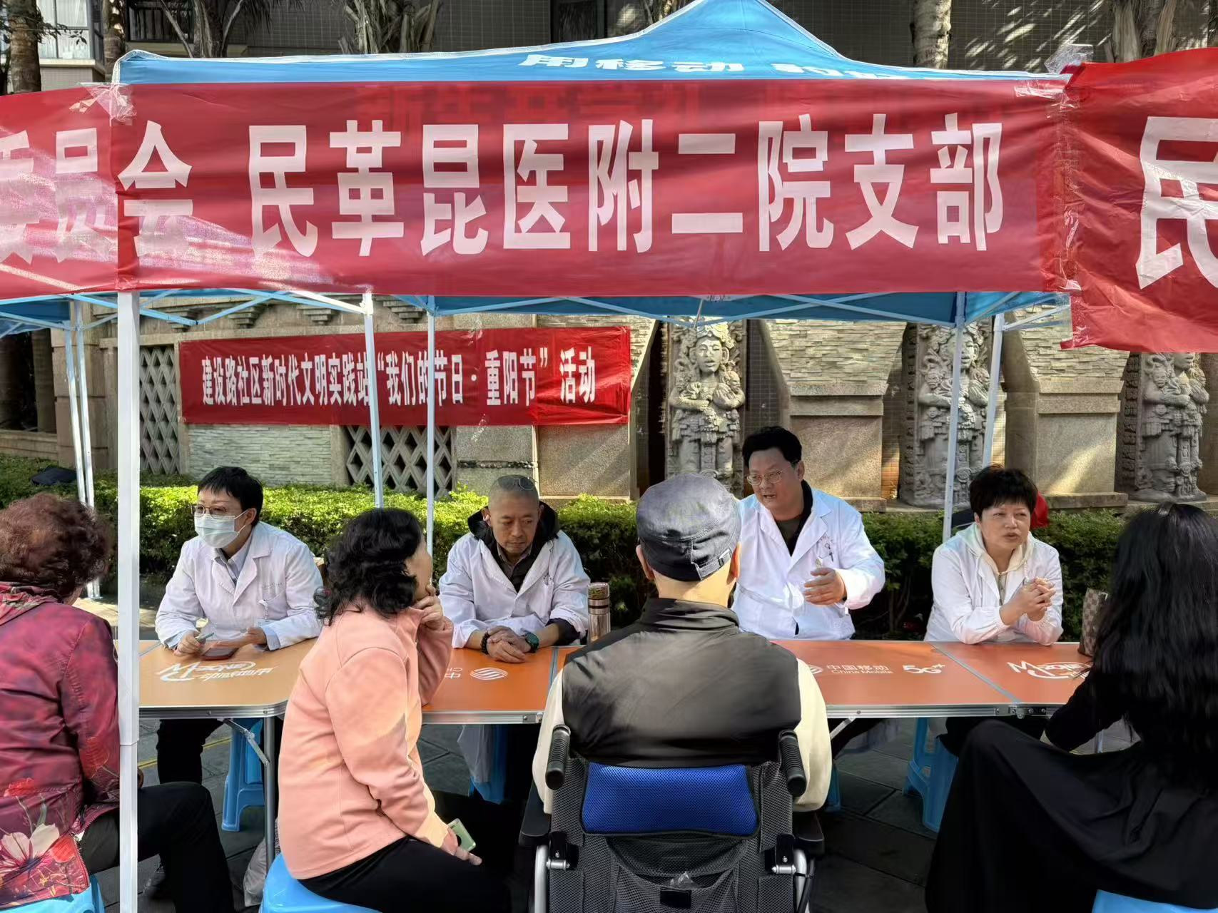 在重阳节来临之际,民革昆明医科大学第二附属医院支部联合民革昆明医科大学第一附属医院支部、民革昆明医科大学第三附属医院支部,以及建设路社区,走进虹山东路巴士西苑小区,共同举办“金秋重阳至、尊老意情长”主题义诊活动。昆明医科大学党委统战部、民革省委会组织处相关领导参加了活动。