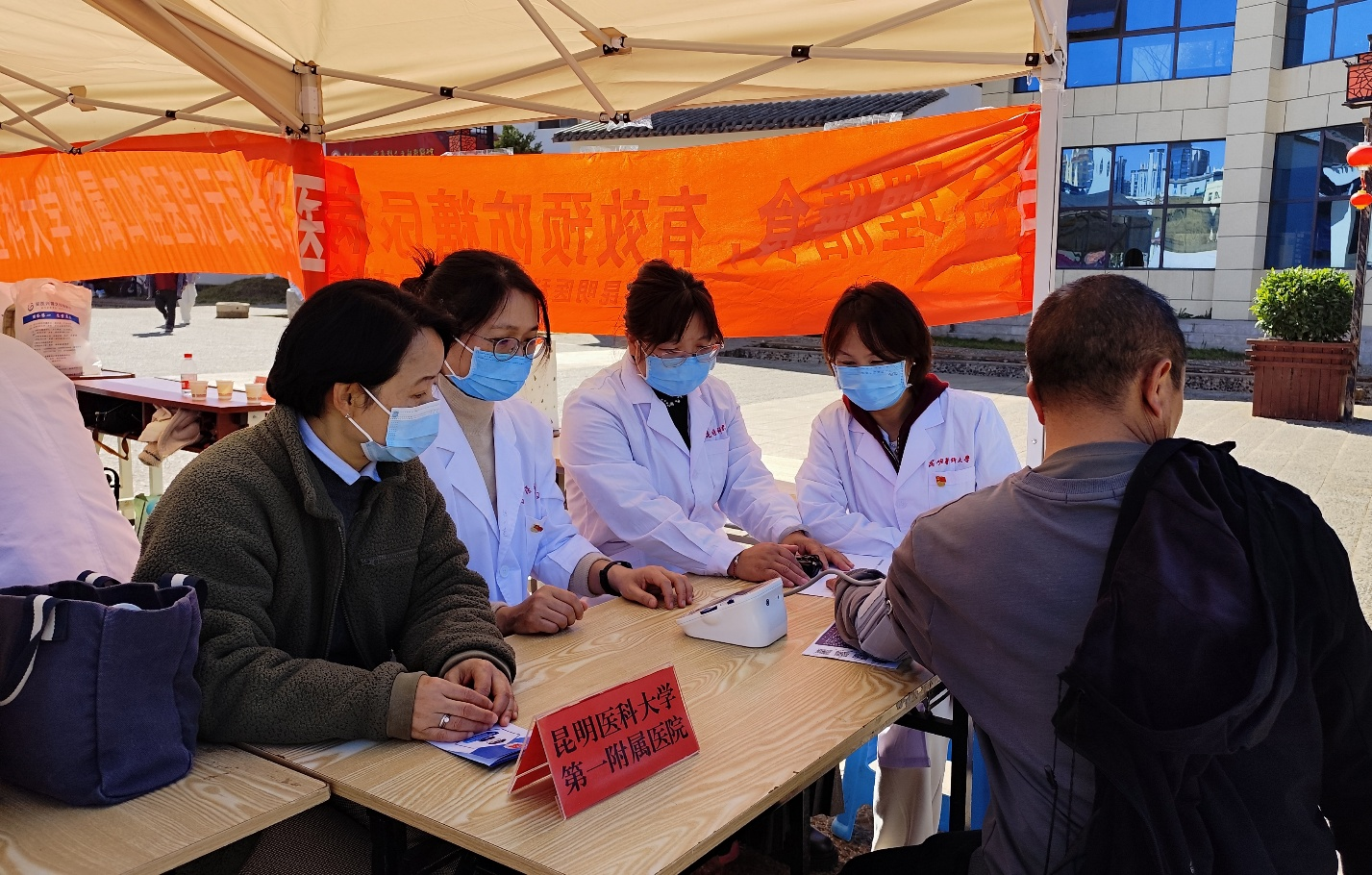 每年1月是云南省民族团结进步宣传教育活动月,今年活动月主题是“沿着习近平总书记的足迹,重温习近平总书记的回信——让民族团结进步之花在云岭大地越开越绚烂”。1月19日,昆明医科大学组织学校留学人员联谊会、直属单位党委、基础医学院、护理学院、第一附属医院、附属口腔医院共同组建医疗义诊和健康宣教服务团队,到学校铸牢中华民族共同体意识教育校外实践基地——洛龙社区,参加民族团结进步宣传教育活动月活动。