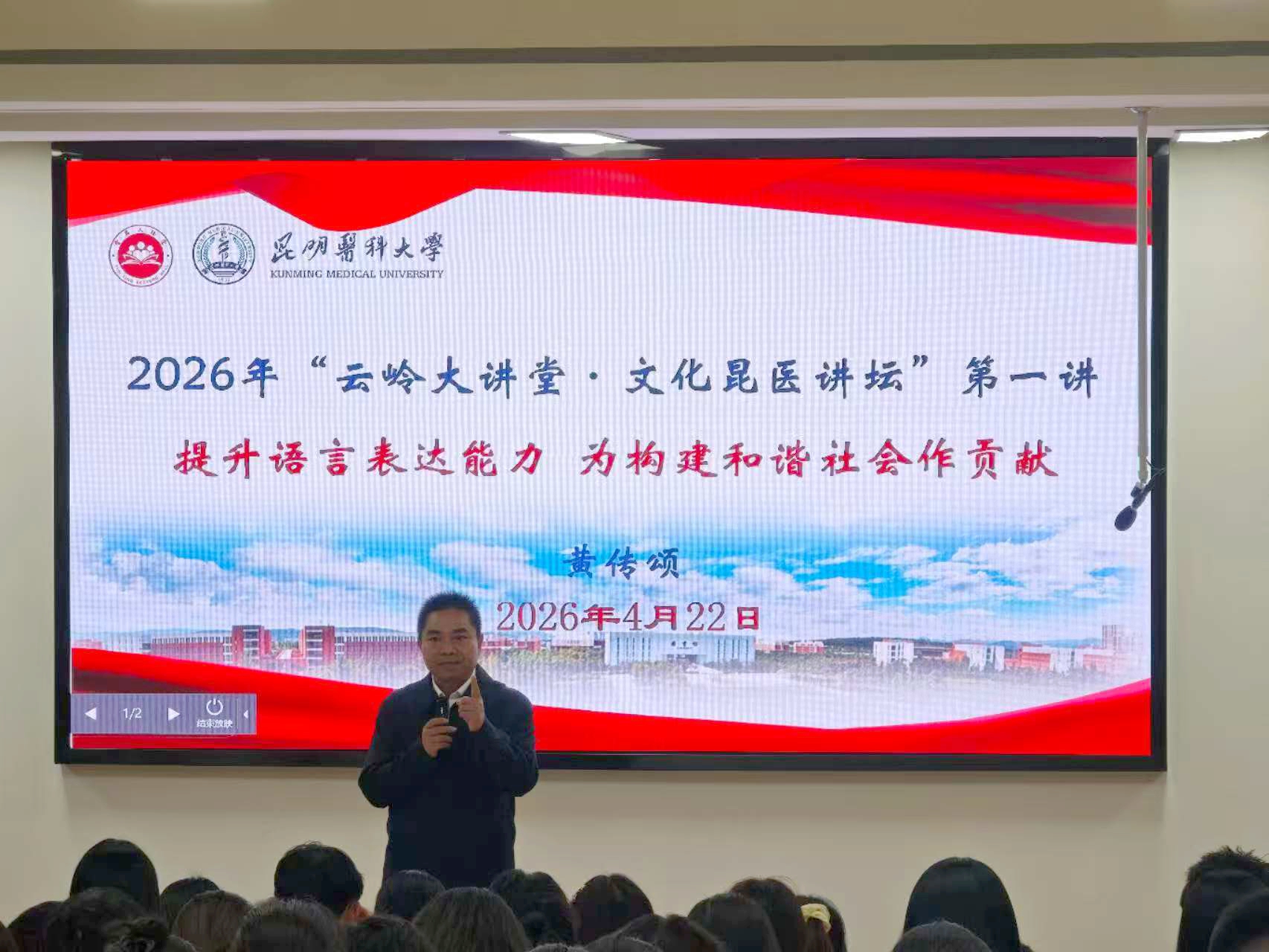 4月22日,医学实践教育高新基地举办2026年“云岭大讲堂·文化昆医讲坛”第一讲,特邀云南省演讲学会会长黄传颂为学生开展以《提升语言表达能力 为构建和谐社会作贡献》为主题的专题讲座。