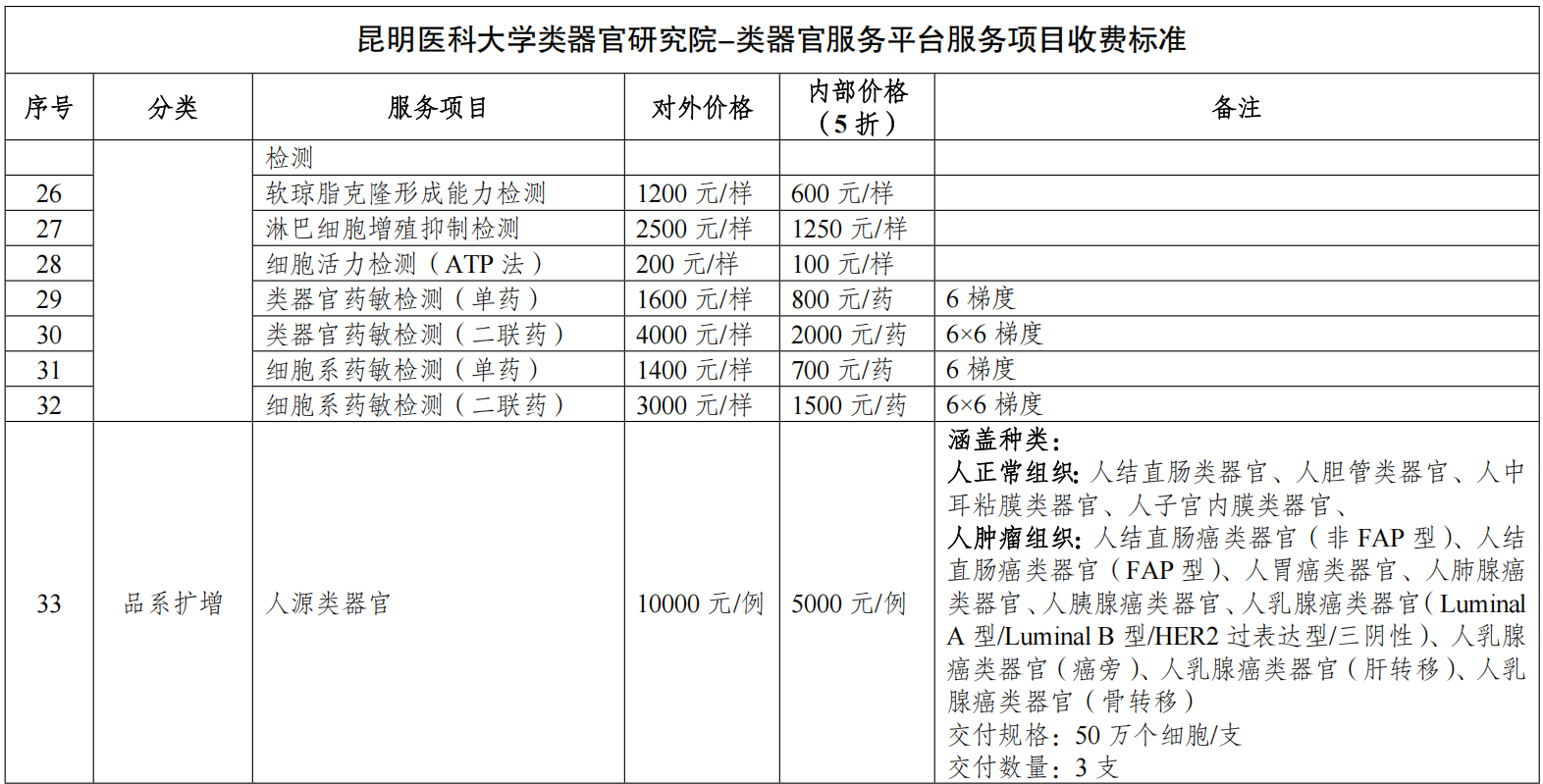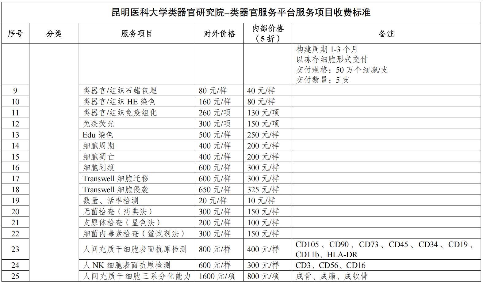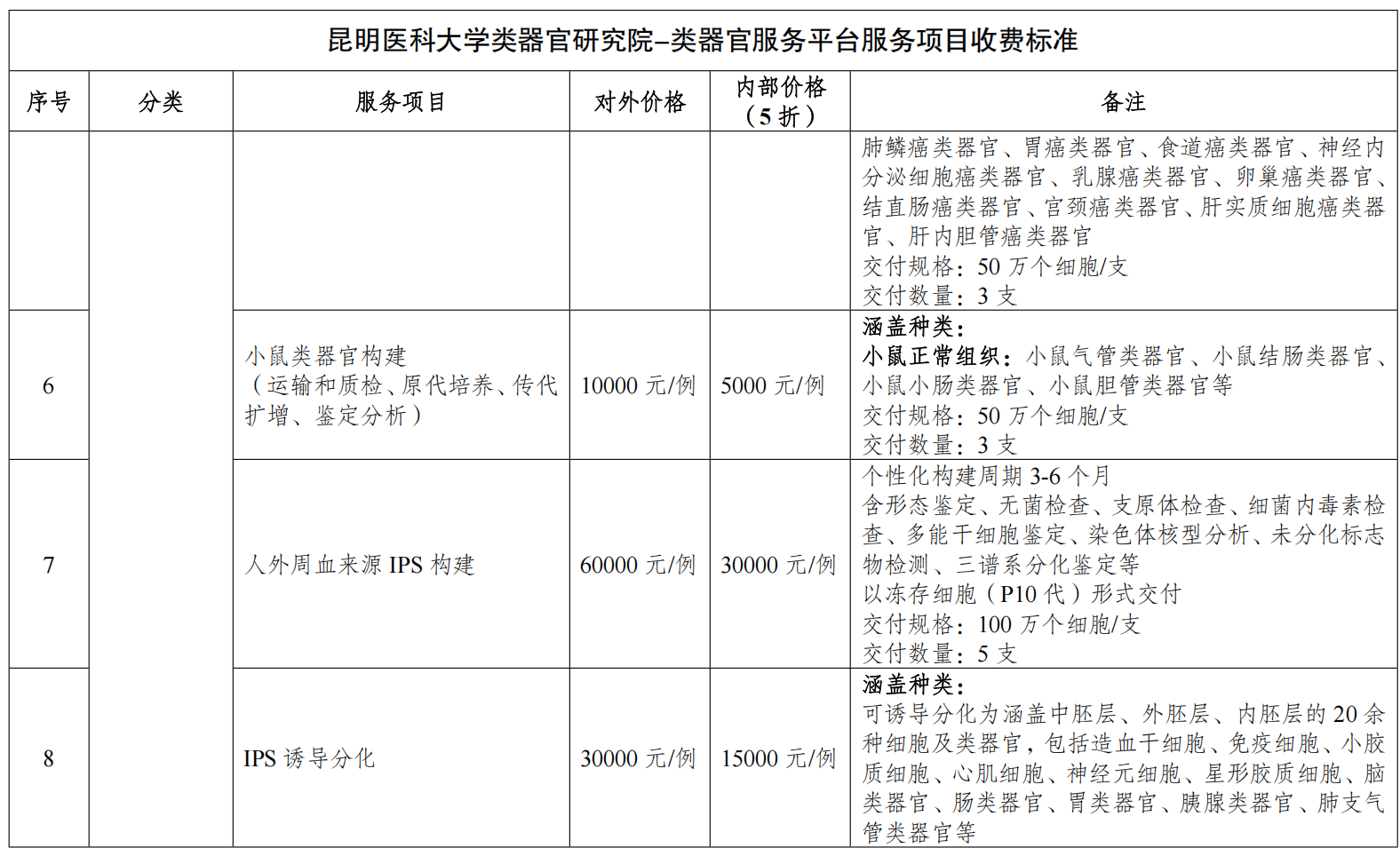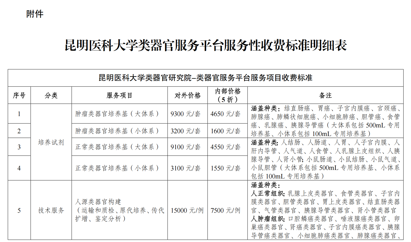 第二条 收费标准。 按《昆明医科大学类器官服务平台服务性收费标准》执行(详见附件)