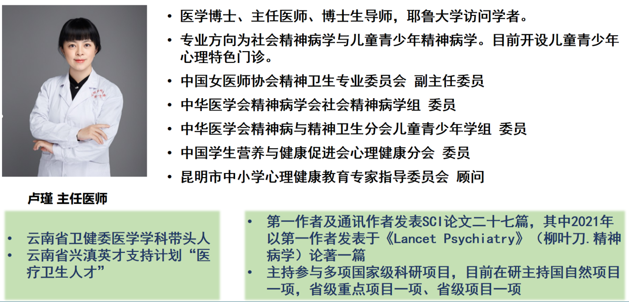 团队带头人为卢瑾教授,团队现有医护人员52人,其中医生24人,护士28人。有正高职称8人、副高职称7人,13名博士、12名硕士,博导1人,硕导9人。团队于2016年获得云南省科技厅资助建设,2019年通过验收。团队目前拥有开放病床80张,年出院患者超过2000余人次,平均住院日均保持在14天以下,CMI值保持在3.7以上,月均门诊超过10000人次,年病床使用率>95%。建设有国家住院医师规范化培训精神科重点专业基地、云南省精神心理疾病临床医学研究中心、云南省精神疾病临床医学中心、云南省宋伟宏院士工作站等多个国家级、省部级平台;2022年医院学科科技量值(STEM)排名67名,2023年排名59名,是云南省唯一进入全国百强的精神医学学科。先后主持或参与国家级、省部级和厅级等各类科研项目80余项,其中国家自然科学基金15项,国家2030脑计划子课题2项,国家级重大项目子项目16项。发表和参与发表论文300余篇,其中SCI论文100余篇,核心期刊100余篇,作为第一及通讯作者单位在《Lancet Psychiatry》、《Psychological Medicine》期刊上发表有国际影响力论文。团队已在抑郁焦虑、精神分裂症、睡眠障碍和老年精神障碍、青少年心理障碍等多中心临床研究形成特色,在精神心理疾病的临床研究诊疗网络的支撑下,以提高我省精神心理疾病的诊治水平为目标,开展区域内不同病种的临床研究及队列建设,如抑郁症及相关障碍、精神分裂症、睡眠和老年精神障碍、儿童青少年心理卫生集中在多动症、青少年情绪障碍等问题进行心理社会因素与生物学交互作用和治疗研究,有外周血生物学数据库;建立了相关疾病脑影像数据库;并完成了对上述疾病进行病因学和治疗学的生物学标记的研究。