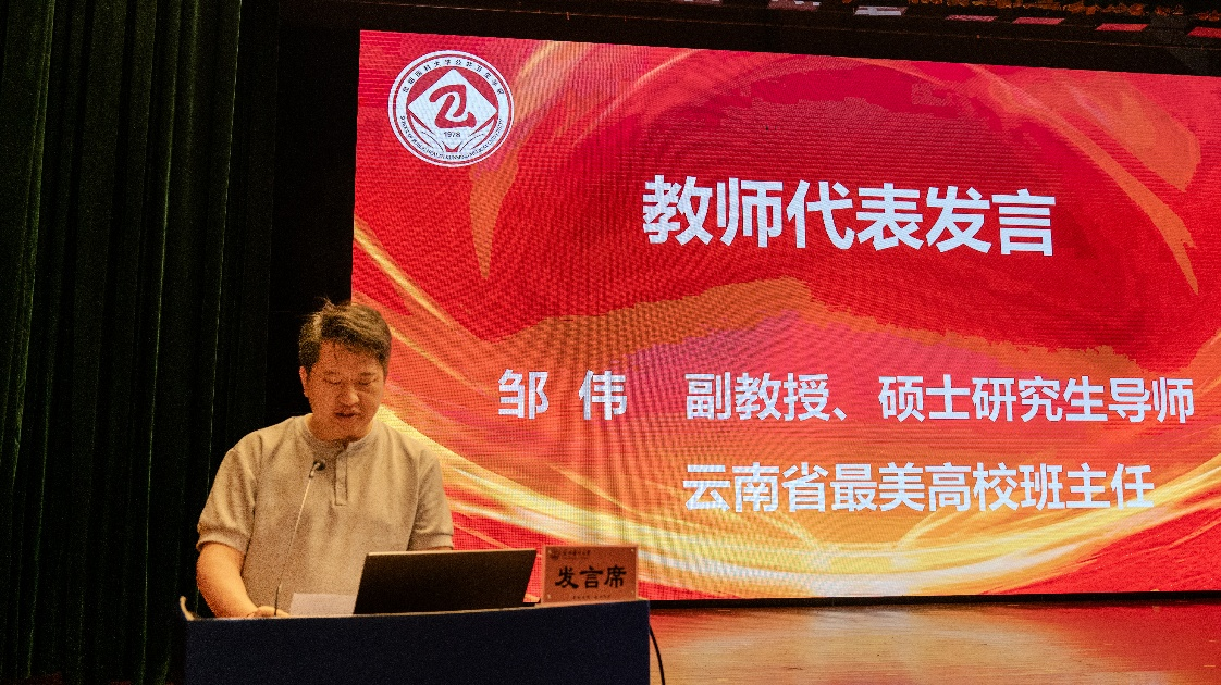 教师代表邹伟老师在发言中表示,将始终坚守育人初心,践行“知行合一”的教育理念。他勉励同学们一要“练就硬核本领”,兼具人文温度与科技锐度;二要“勇于躬身实践”,深入现实场景解决公共卫生问题;三要“培育坚毅品格”,不畏挫折、携手前行。