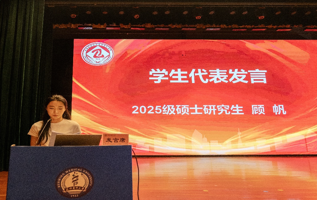 2025级流行病与卫生统计学专业硕士研究生顾帆作为研究生代表,分享了她五年来在公卫领域的求学历程与思考。她围绕“勤学·笃行·担当”三个关键词,鼓励新生筑牢学识根基、践行公卫使命、勇担时代责任,并以大家“四个一”和大家共勉:一份“空杯心态”,一份“钻研精神”,一份“为民情怀”,一份“奋斗激情”,勉励同学们以“公怀”之心拥抱世界,以“济世”之志服务人民。