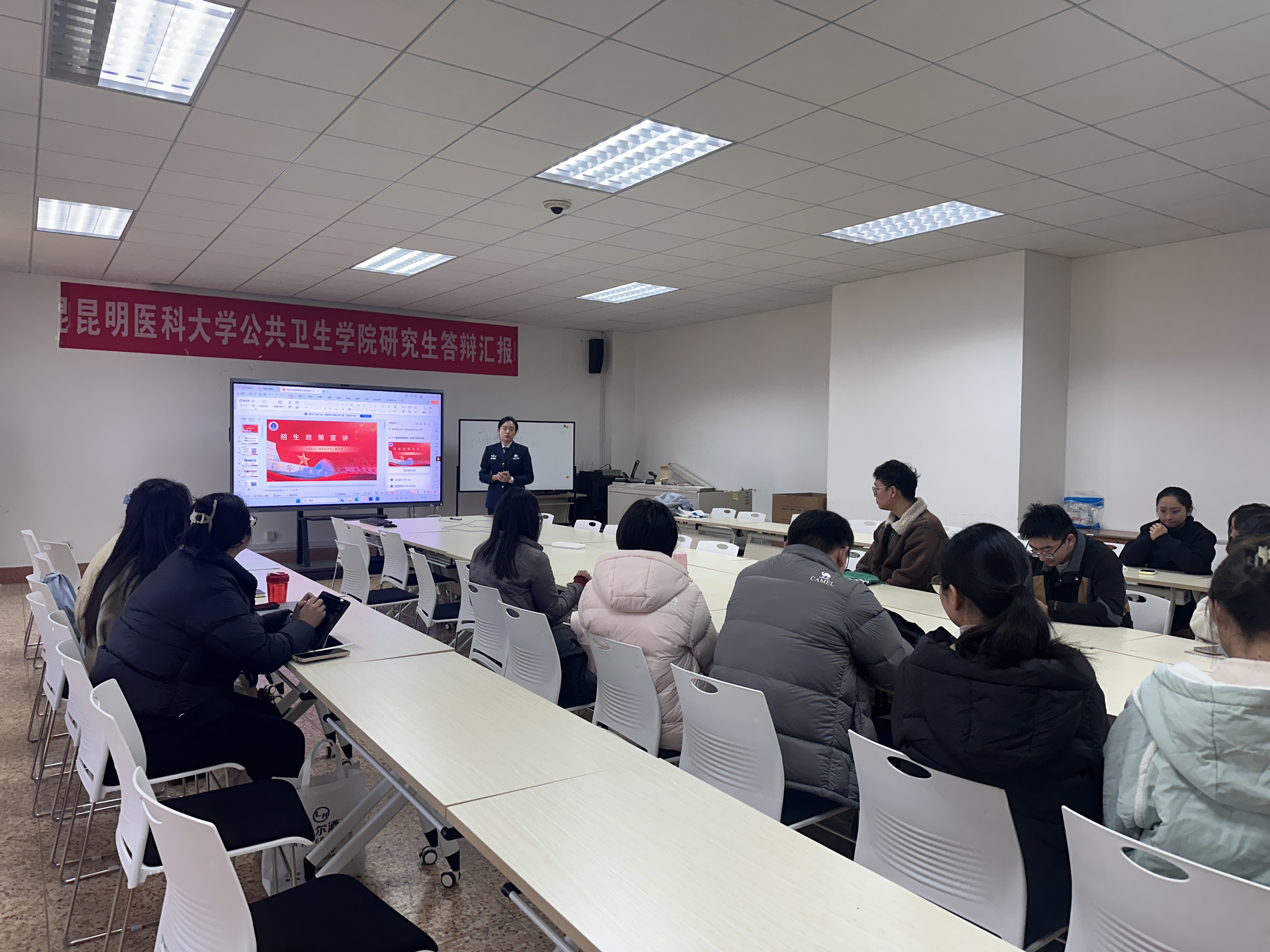 与此同时,在达观楼507会议室,海军军医大学面向昆明医科大学公共卫生学院在读研究生、博士后开展了人才政策专题宣讲。宣讲内容涵盖高层次人才引进计划、军队直招军官与文职人员招聘政策、博士后科研工作站招录条件与待遇等,吸引了众多学子积极参与和咨询。