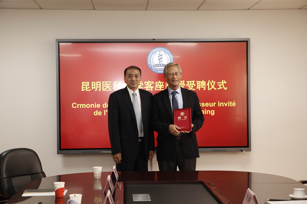 经学校学术委员会评议通过,9月19日下午,授予法国巴黎第七大学儿科学专家Jean-Christopher Mercier教授为昆明医科大学客座教授。受聘仪式在呈贡校区校务管理中心举行。副校长解保生为Mercier教授颁发聘书,并代表学校与Mercier教授就昆明医科大学和法国巴黎第七大学及其Robert Debré附属医院建立合作关系和师生交流等事宜进行了商讨。学校国际交流合作处及第一附属医院相关人员参加了受聘仪式。