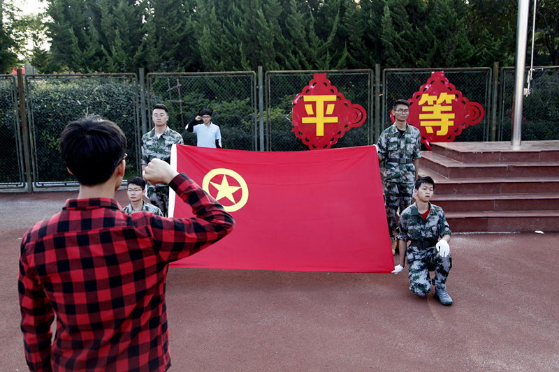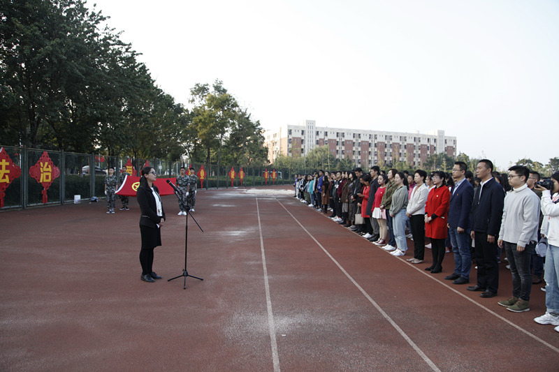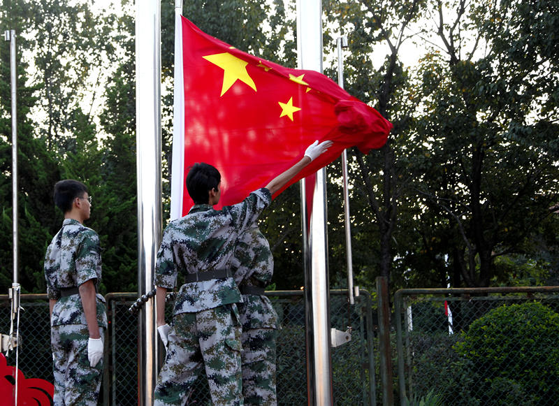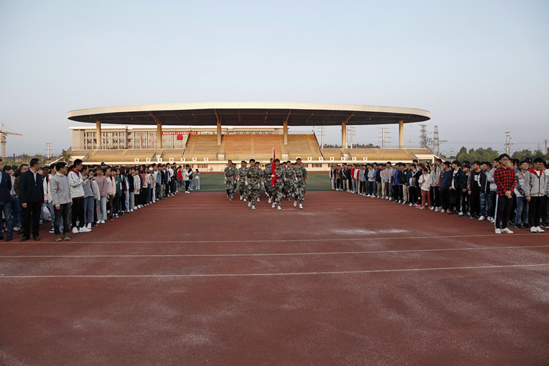 上午7点30分,国旗护卫队迈着铿锵有力的步伐护送鲜艳的五星红旗走向国旗台,全体师生迎旗。