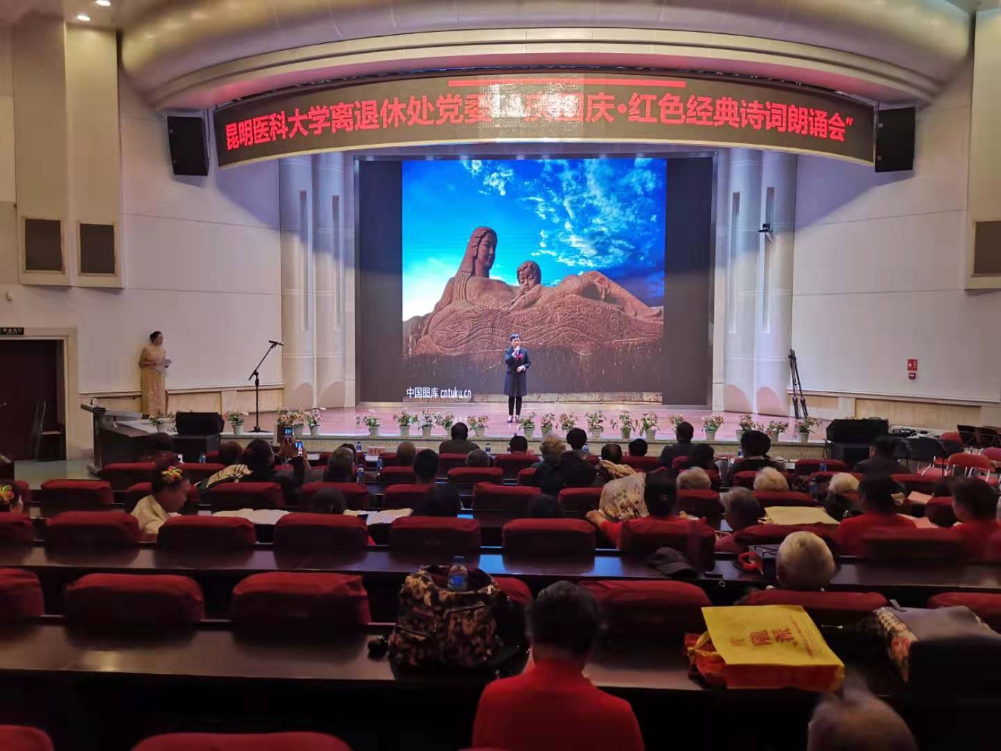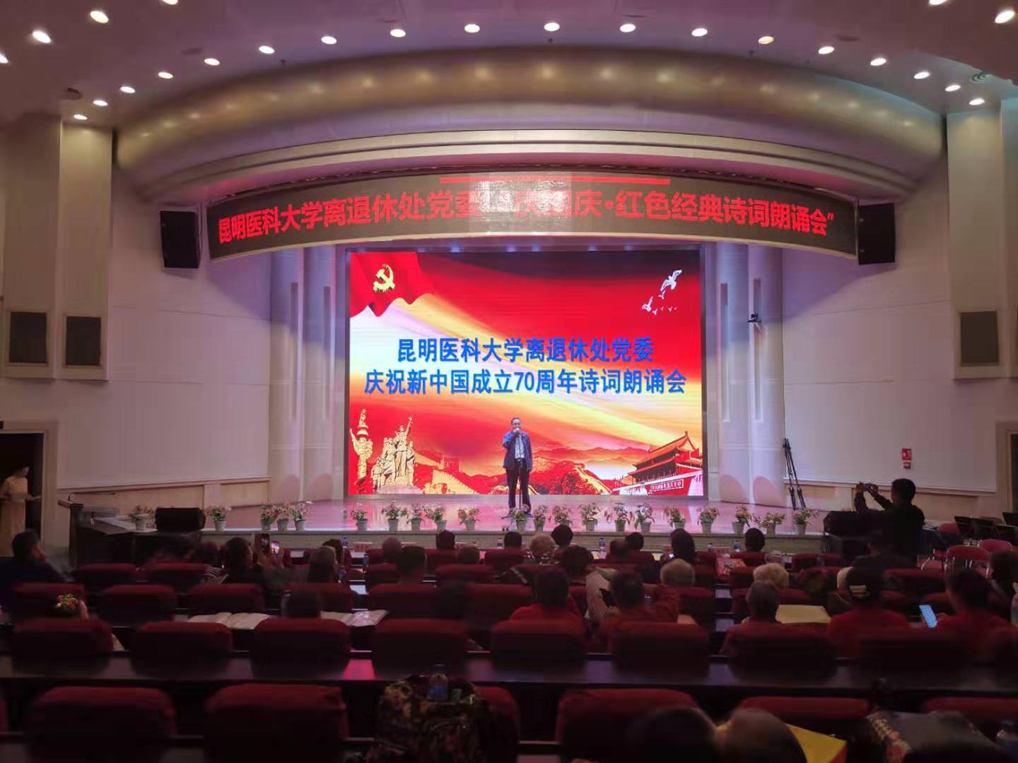 在庆祝新中国成立70周年之际和深入开展“不忘初心、牢记使命”主题教育期间,9月24日下午,离退休工作处党委在学校第一附属医院报告厅举办“庆国庆?红色经典诗歌朗诵”比赛,学校党委副书记李铭,退休老领导冯忠堂、郭永章、孙红坚、陈德昌、罗礼宏、戴江明等出席活动。