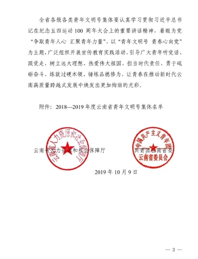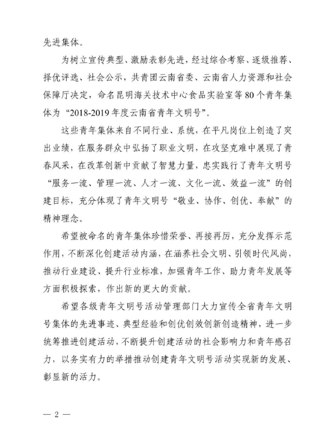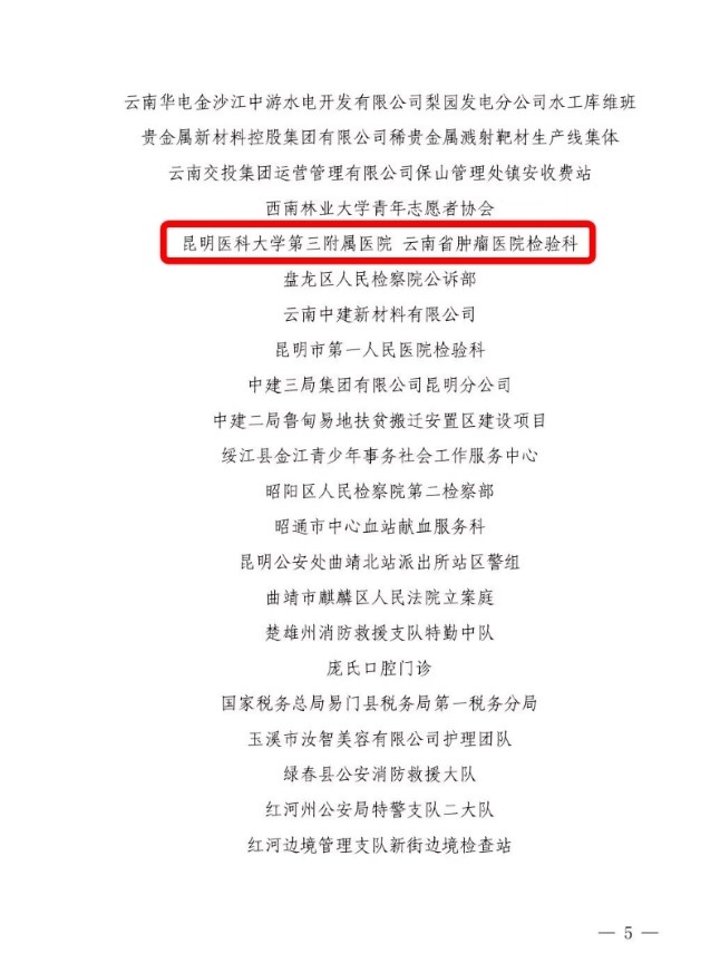 为树立宣传典型、激励表彰先进,近日,经过综合考察、逐级推报、择优评选、社会公示,共青团云南省委、云南省人力资源和社会保障厅决定,命名全省80个青年集体为“2018—2019年度云南省青年文明号”。其中,昆明医科大学第三附属医院暨云南省肿瘤医院检验科榜上有名!
