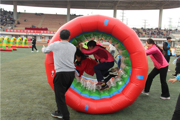 11月14日下午,第四十一届田径运动会开幕式结束后,我校教职工趣味运动赛在呈贡校区西苑足球场如期举行。本次趣味赛共设三个比赛项目:勇往直前、车轮滚滚、动感五环,比赛中全体教职工以饱满的热情投入比赛,在场上密切配合,奋力拼搏,最终经过激烈的角逐,直属单位和基础医学院教职工以优异的成绩拔得头筹,荣获一等奖;后勤服务发展中心、昆明医科大学第三附属医院、继续教育学院位列其后,荣获二等奖;昆明医科大学第二附属医院、药学院、口腔学院、护理康复学院联队、法医学院也不甘示弱,荣获三等奖。