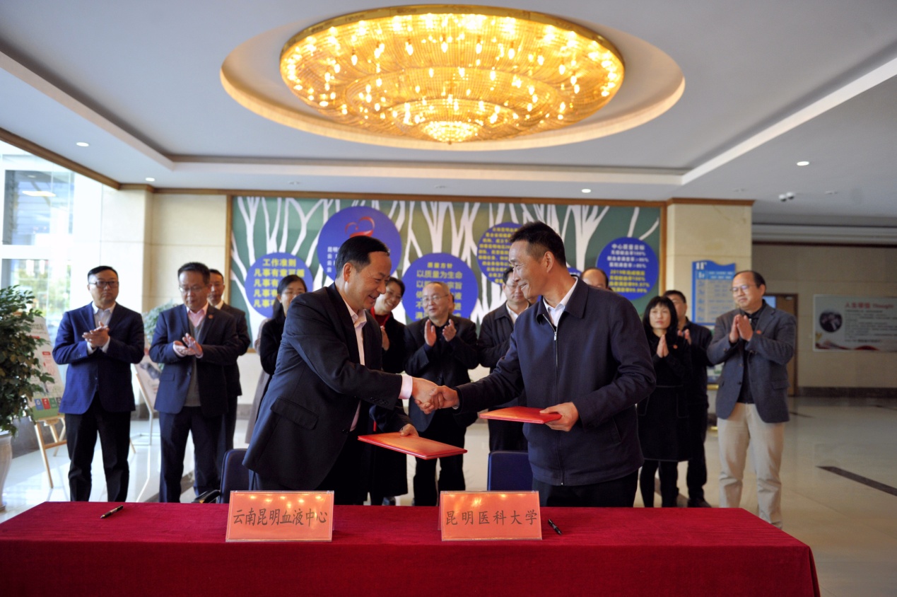 李利华与冯凌代表双方共同签署了战略合作协议。李松和黄兴黎等共同为“昆明医科大学输血医学研究与转化中心”揭牌。
