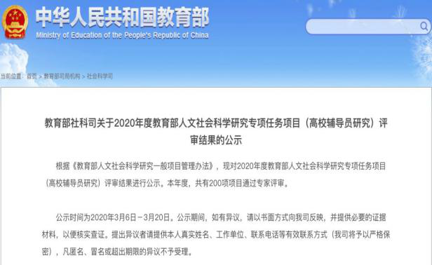 据悉,经教育部网站公示,并经教育部社会科学司组织专家评审批准,今年共有200个项目获2020年度教育部人文社会科学研究专项任务项目(高校辅导员研究)立项,云南省有5所高校获立项。