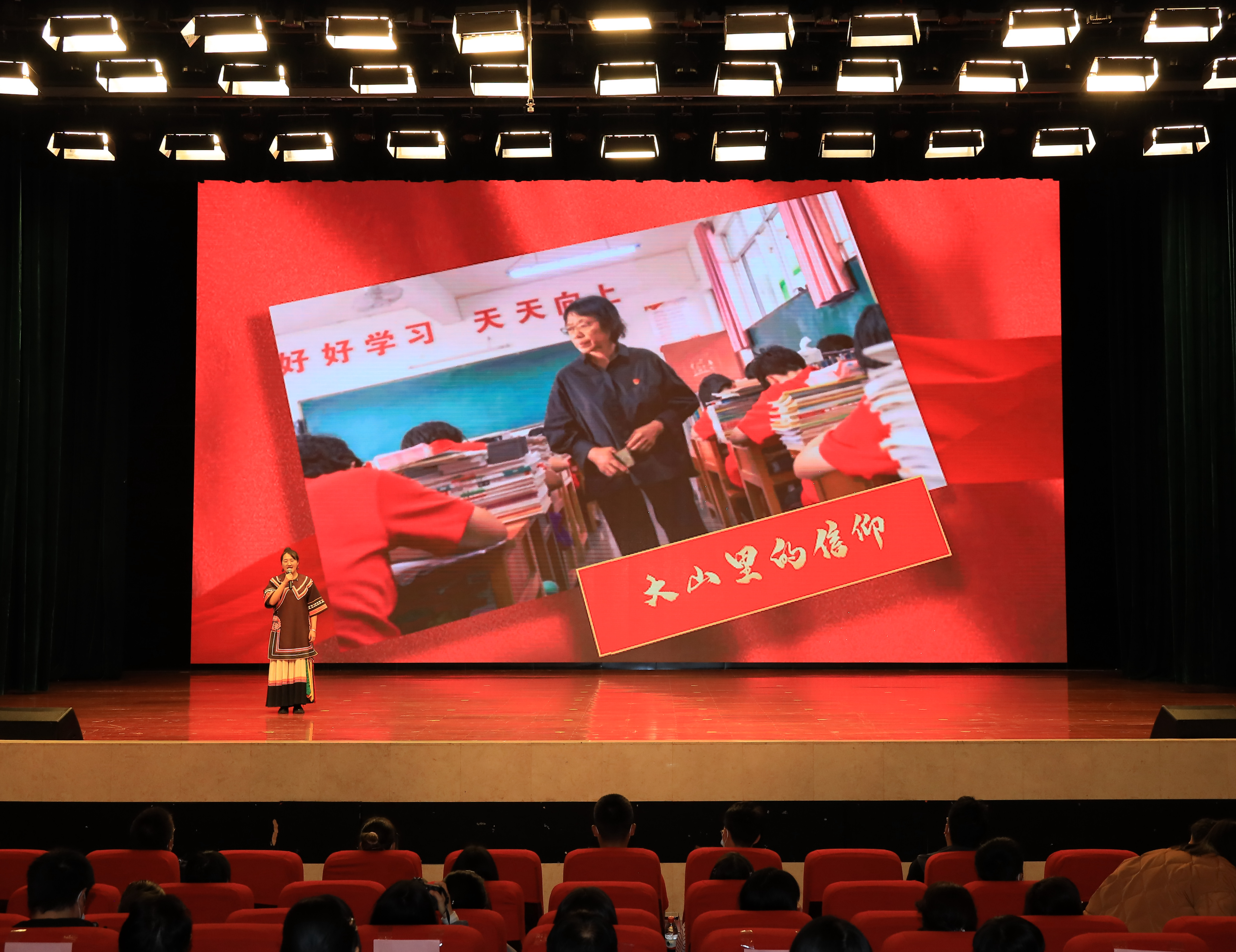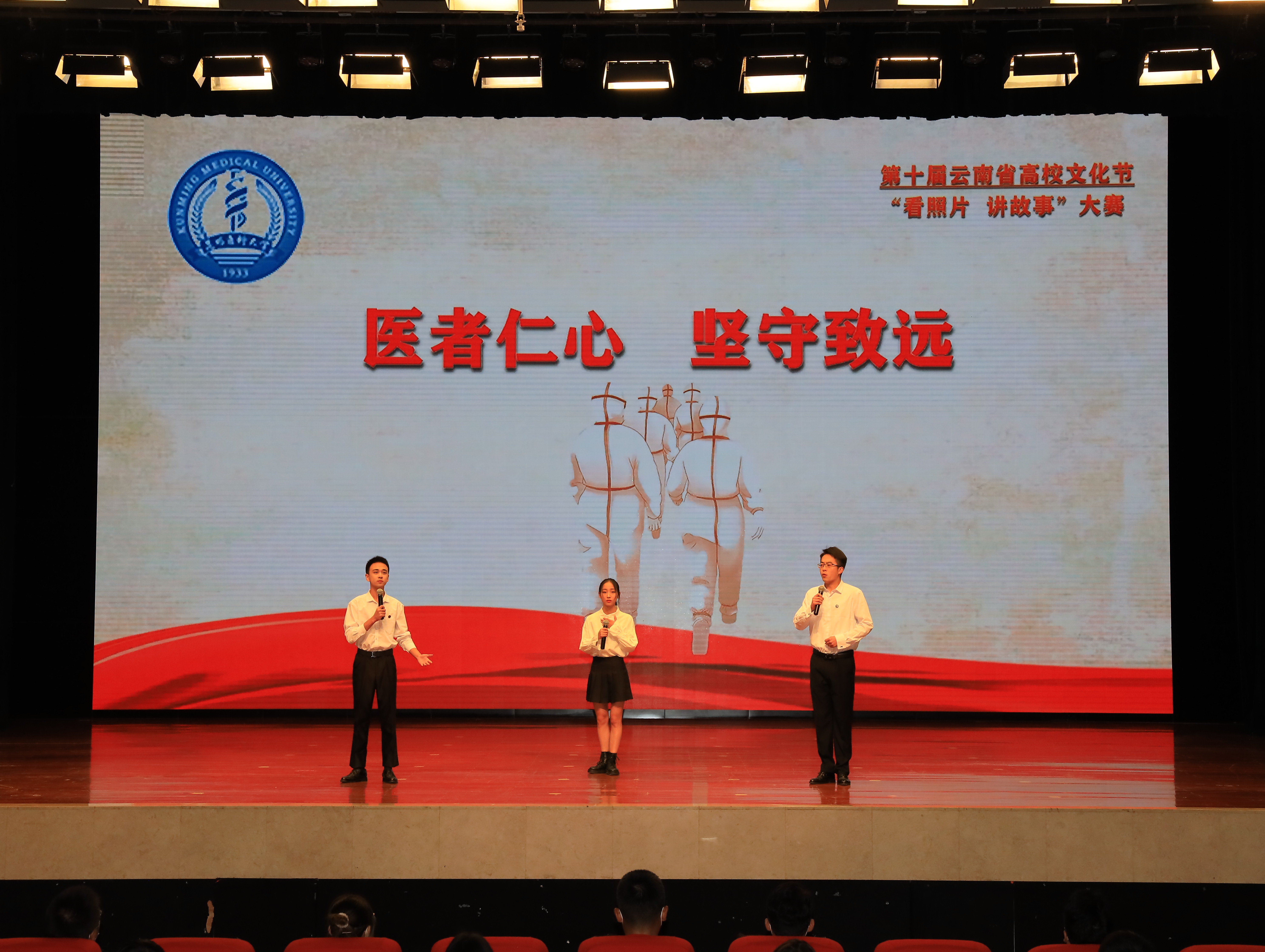 决赛现场,选手们含泪讲述了张桂梅的故事,疫情期间吴亚玲的故事,家乡的脱贫故事……昆明医科大学郭畅、王凯迪、杨静3位同学带来的《医者仁心 坚守致远》,讲述了在抗击新冠肺炎疫情中,无数白衣天使逆行出征,以大爱仁心书写了抗疫奇迹的故事。