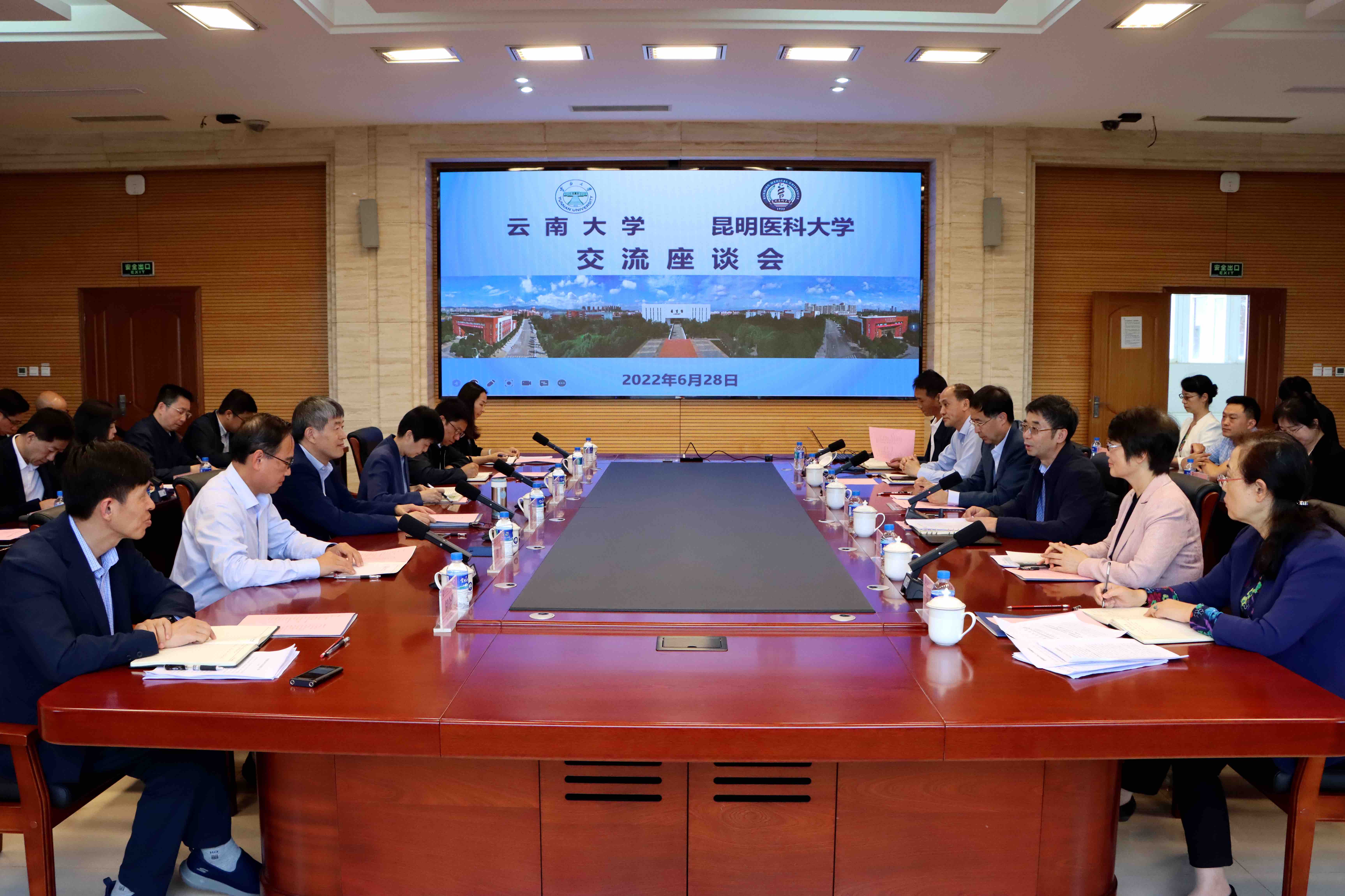6月28日,云南大学校长方精云院士,副校长赵琦华、刘波、吴建德、胡金明,校党委常委、校长助理贾月萍及相关职能部门负责人一行赴昆明医科大学,就新医科建设等有关问题开展座谈交流。昆明医科大学党委书记尹向阳、校长李松,副校长李燕、解保生、张爱云、李利华及相关职能部门负责人等参加座谈会。
