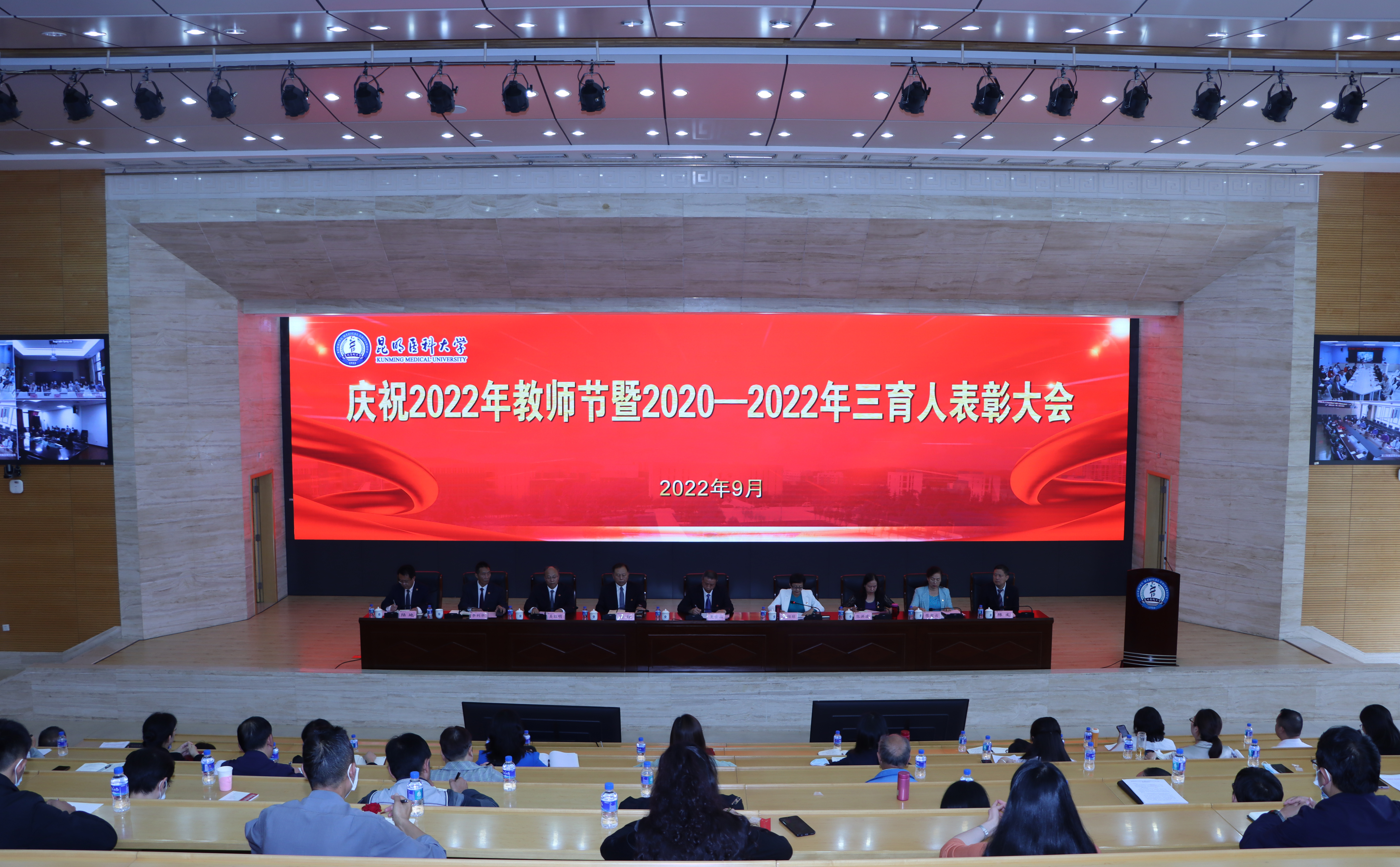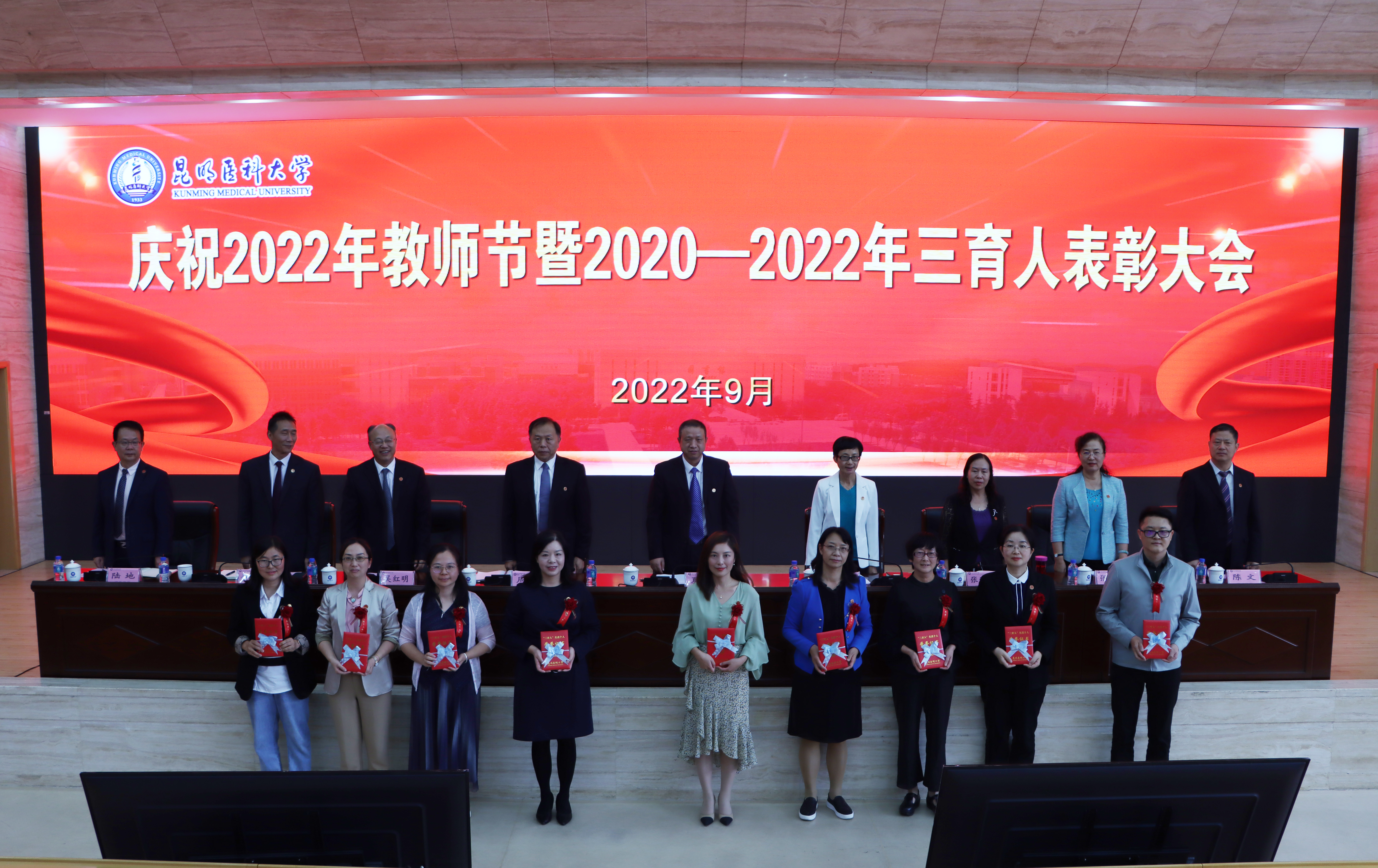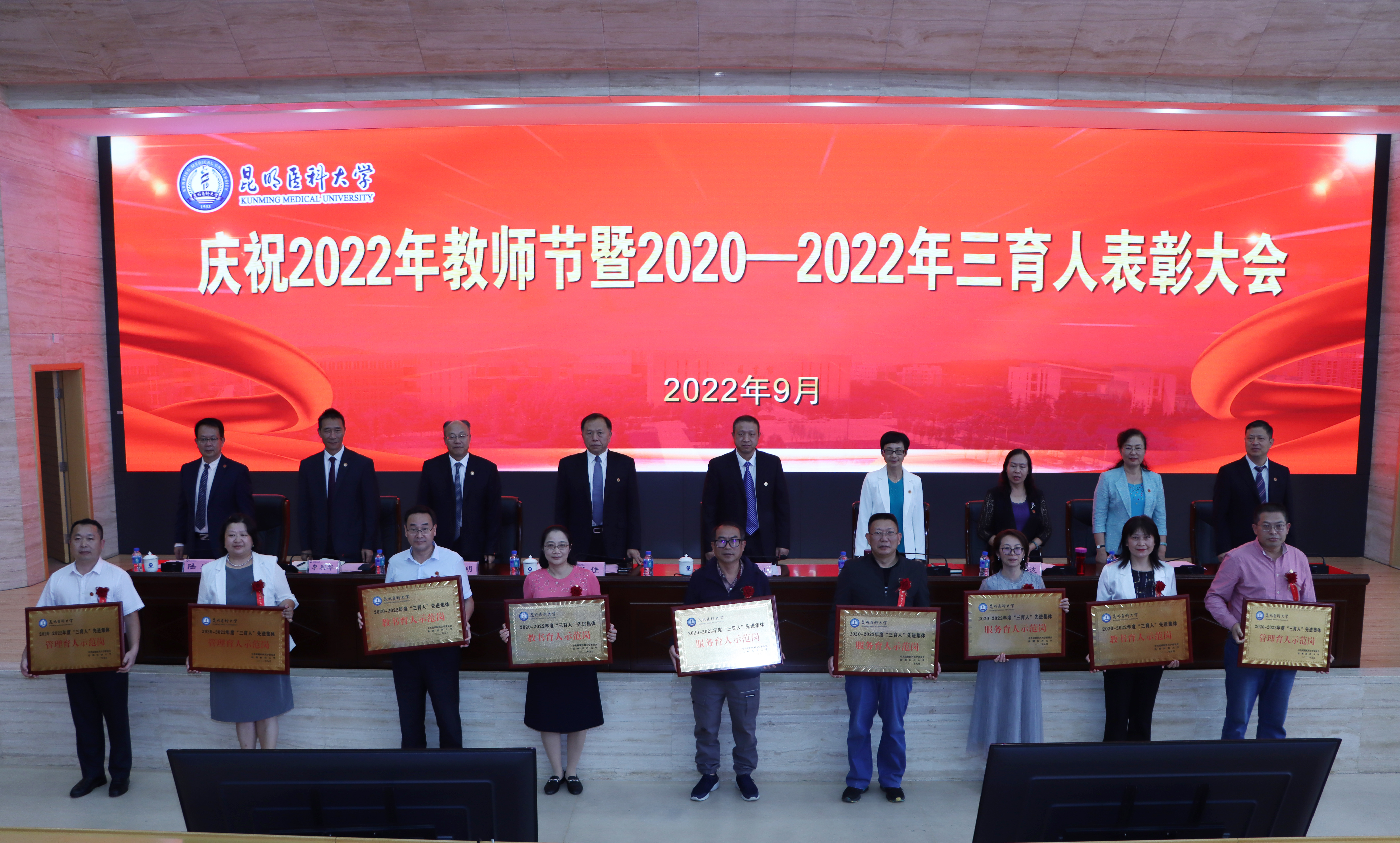9月9日下午,昆明医科大学召开庆祝2022年教师节暨2020—2022年度“三育人”表彰大会,对在教书育 人、管理育人、服务育人工作中表现优异的130个先进集体和1519名先进个人进行表彰奖励。