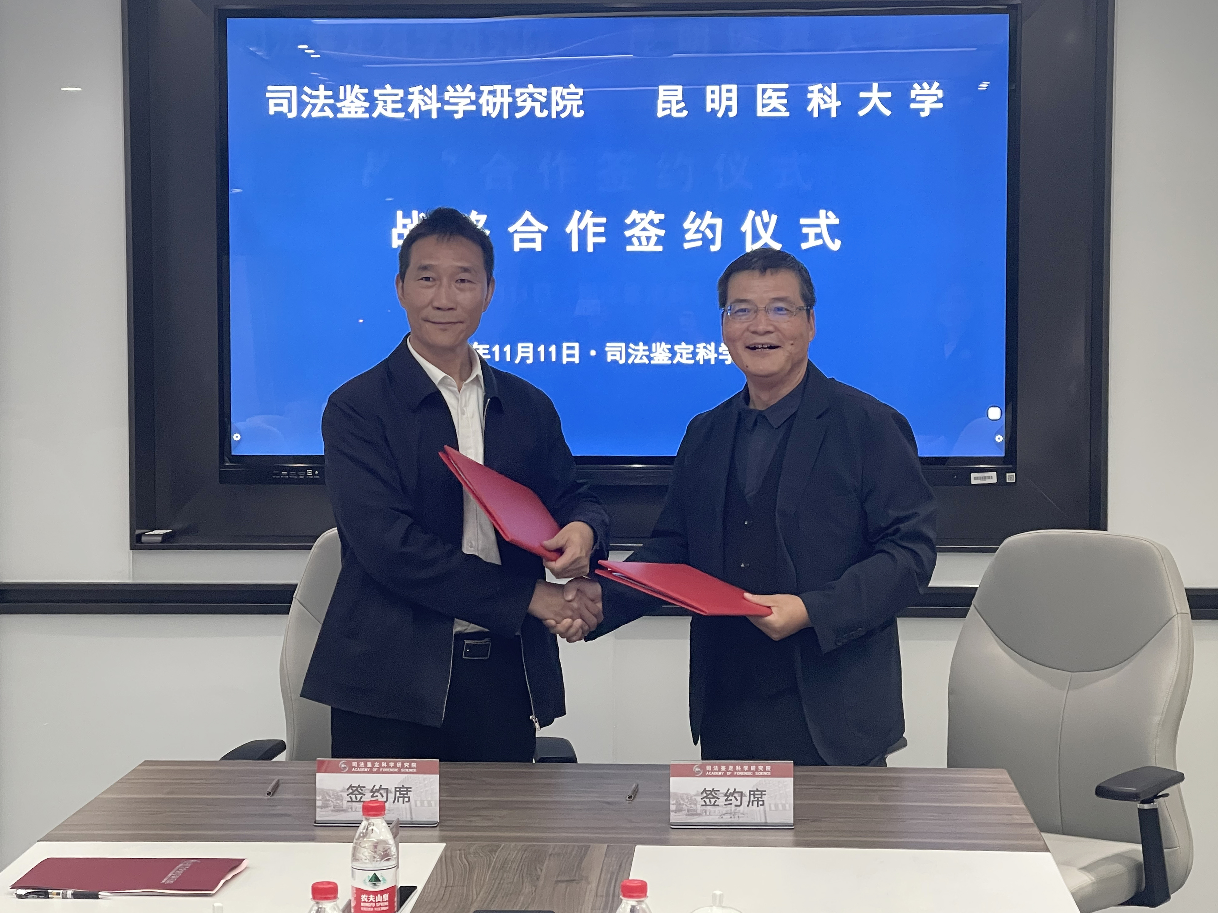 11月11日下午,昆明医科大学与司法鉴定科学研究院战略合作签约仪式在上海举行。校党委委员、副校长李利华,法医学院相关负责人;司法鉴定科学研究院党委副书记、院长吴何坚,副院长管唯、科研管理处处长李成涛等参加了签约仪式,李利华、吴何坚分别代表双方签署了合作协议。