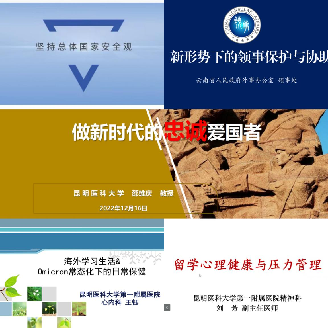 云南省人民政府外事办公室领事处副处长武文杰,昆明医科大学党委宣传部部长邵维庆,昆明医科大学第一附属医院教授王钰、刘芳等多位专家,围绕爱国主义、领事保护、总体国家安全观、海外注意事项及疫情防控的日常保健、留学人员心理健康等内容进行专题讲授和经验分享。