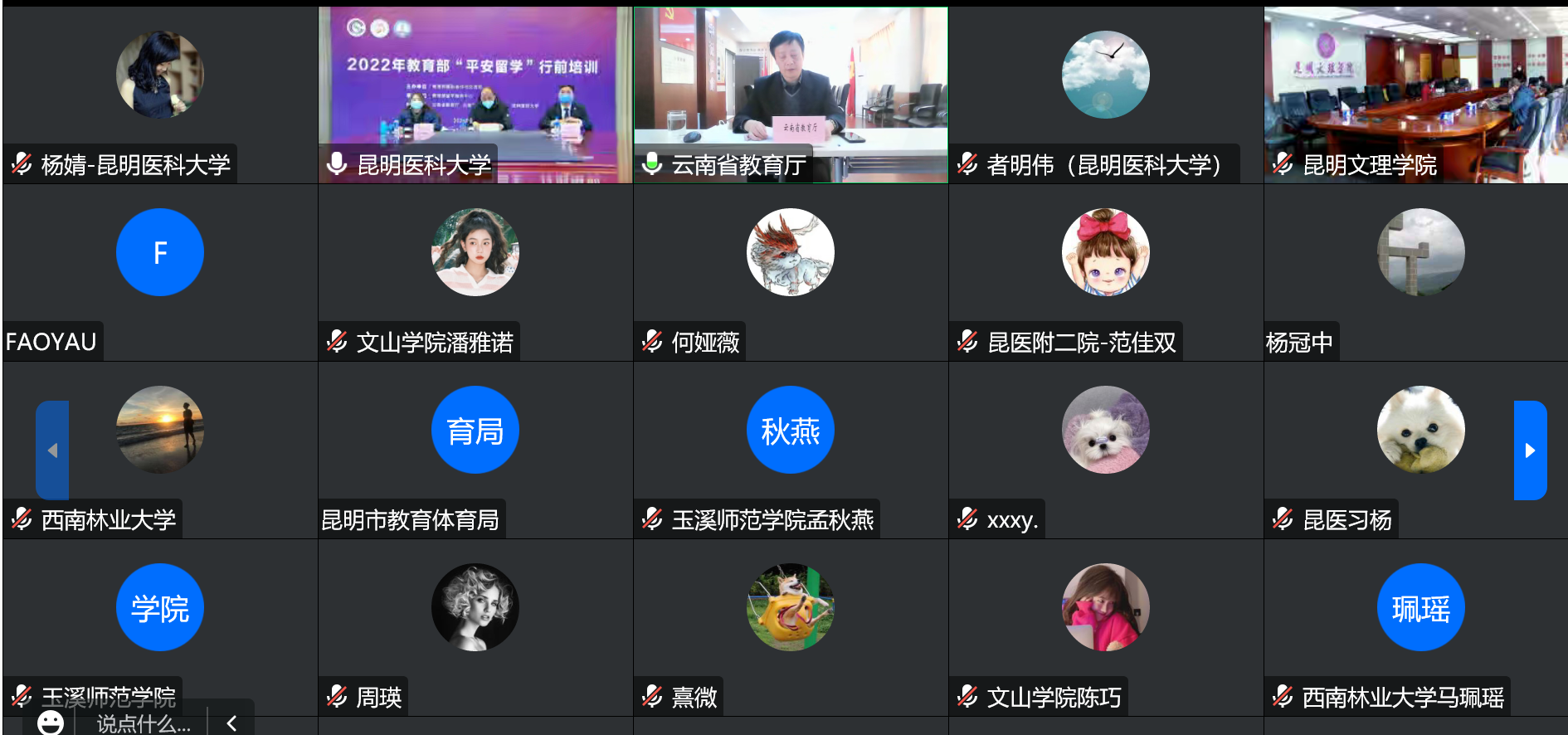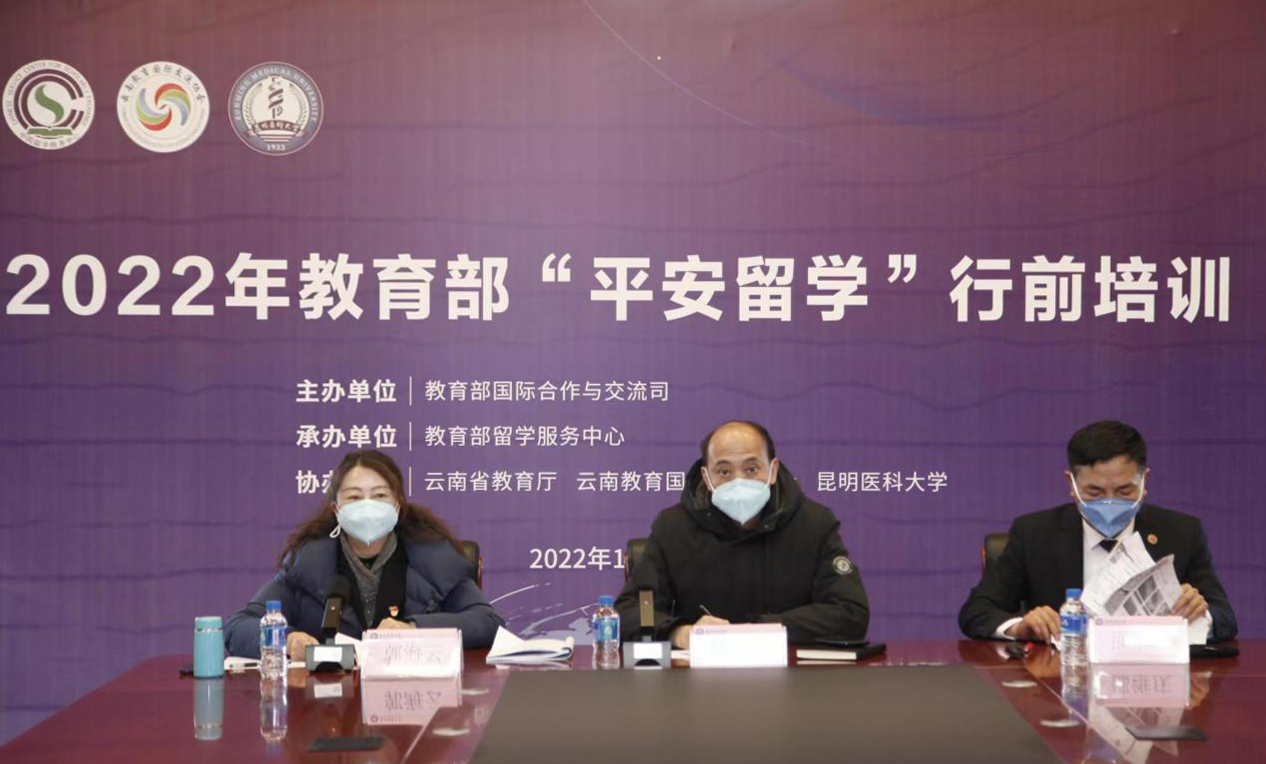 12月16日下午,由教育部国际合作与交流司主办,教育部留学服务中心承办,云南省教育厅、云南教育国际交流协会和昆明医科大学共同协办的2022年教育部“平安留学”行前培训会云南站在昆明医科大学举行。