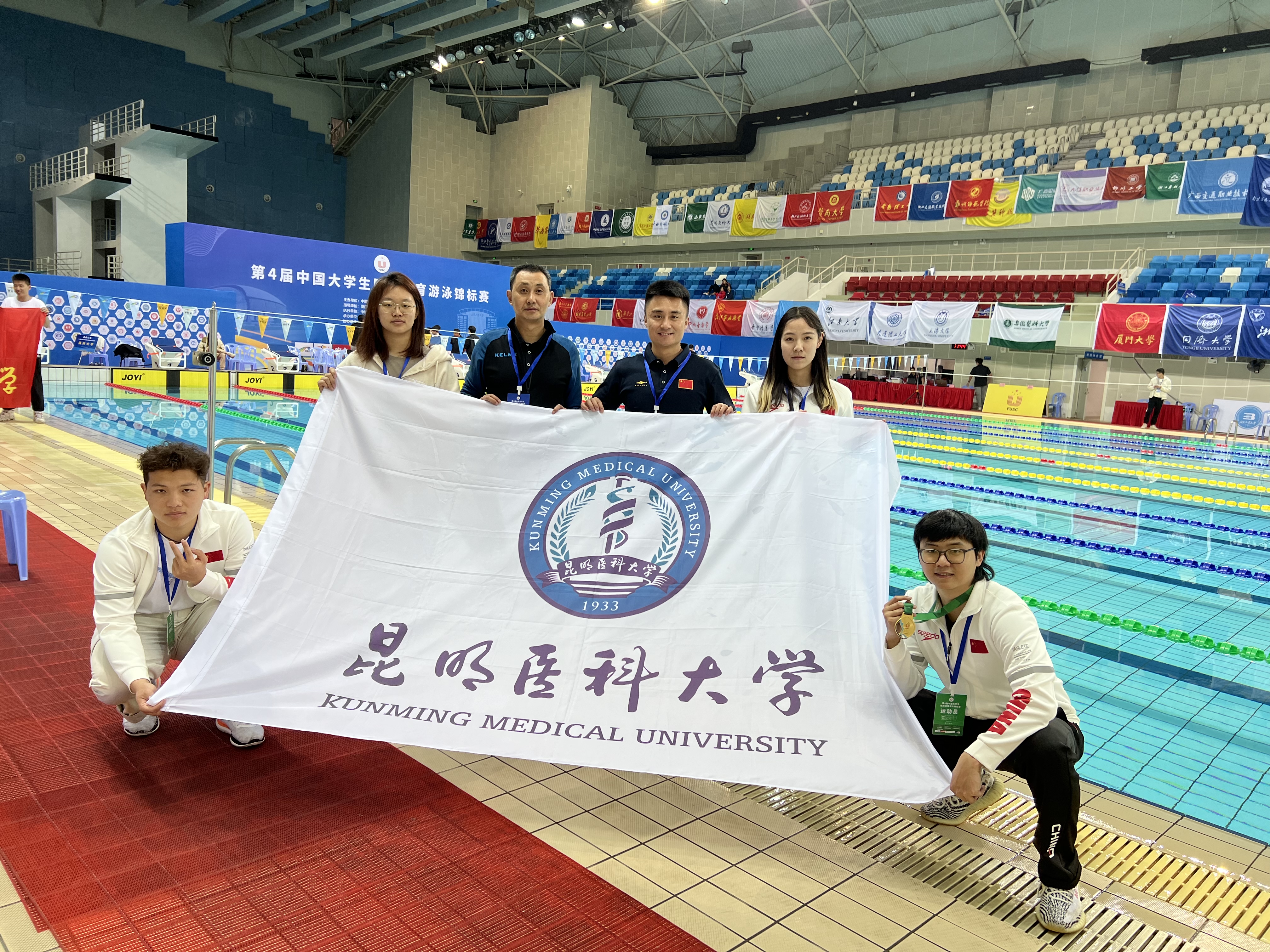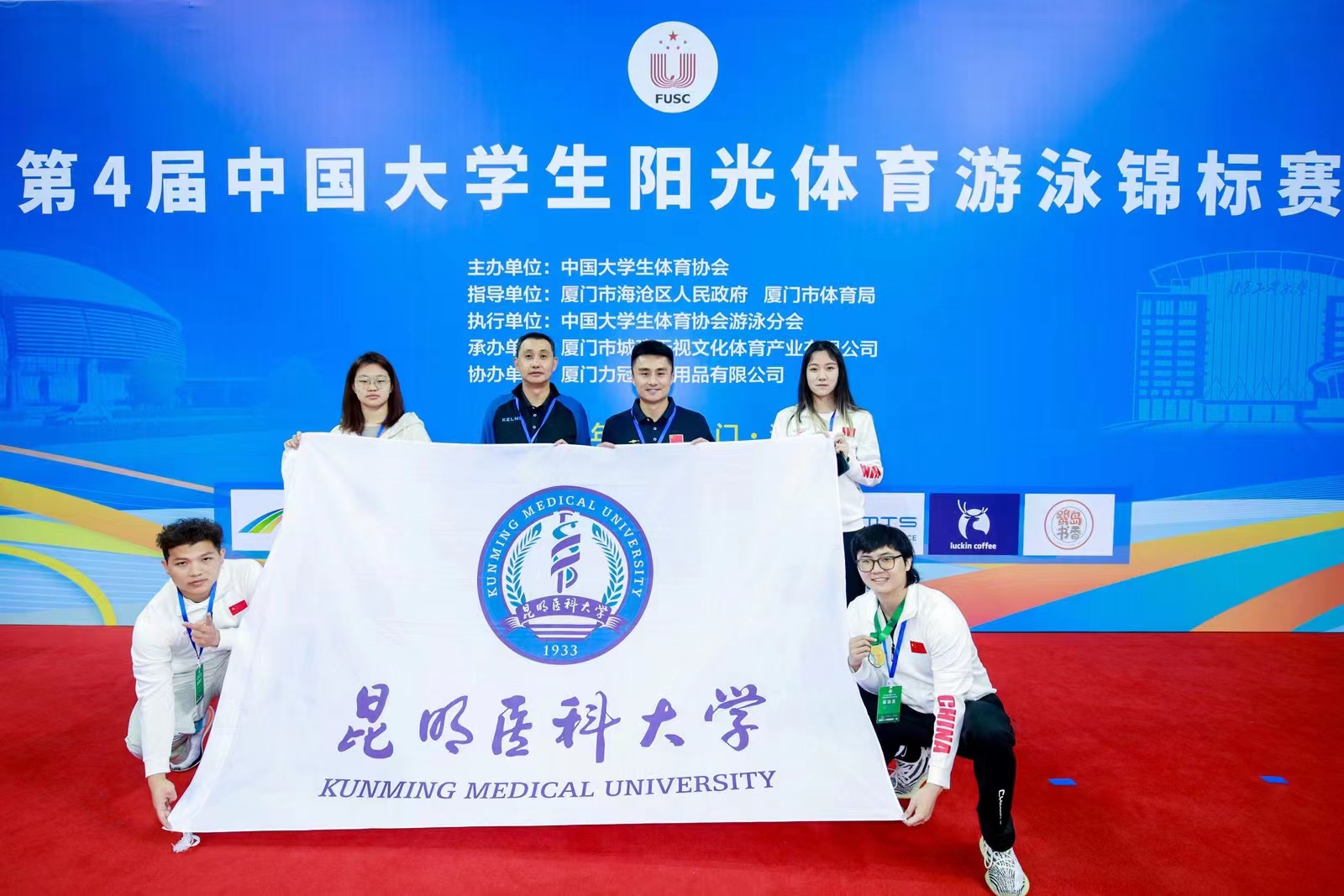 第4届中国大学生阳光体育游泳锦标赛于近日在厦门海沧区落幕,昆明医科大学游泳队共派出4名队员参加比赛,乔鹏宇以2分33秒的成绩夺得男子甲组200米蝶泳金牌,黄晓涵位列女子甲组50米仰泳第四名、50米自由泳第五名,姜雨凝获女子甲组200米蝶泳第九名,刀承业获男子甲组50米仰泳第十七名。这是我校在全国游泳项目比赛中取得的历史性突破。