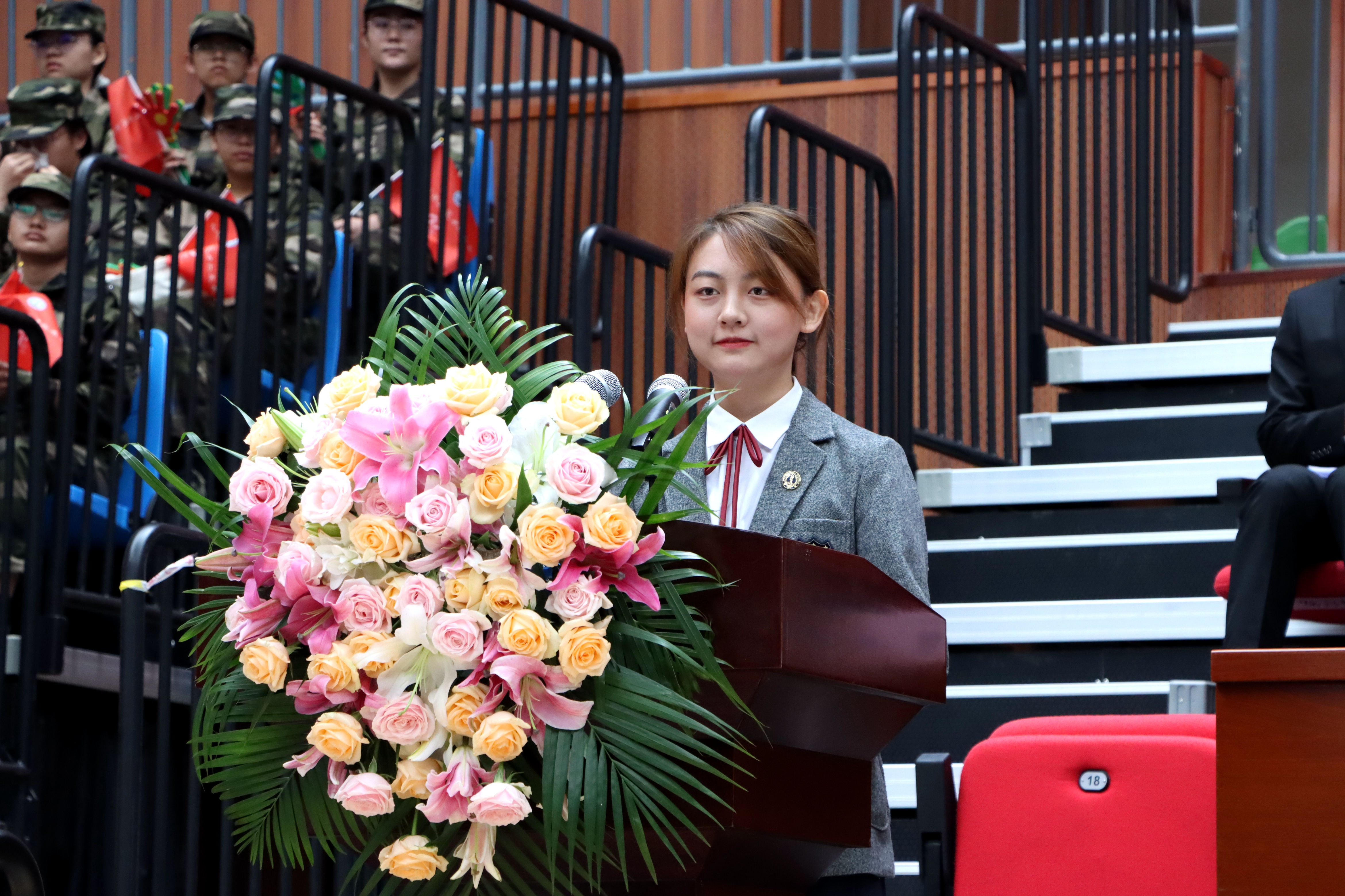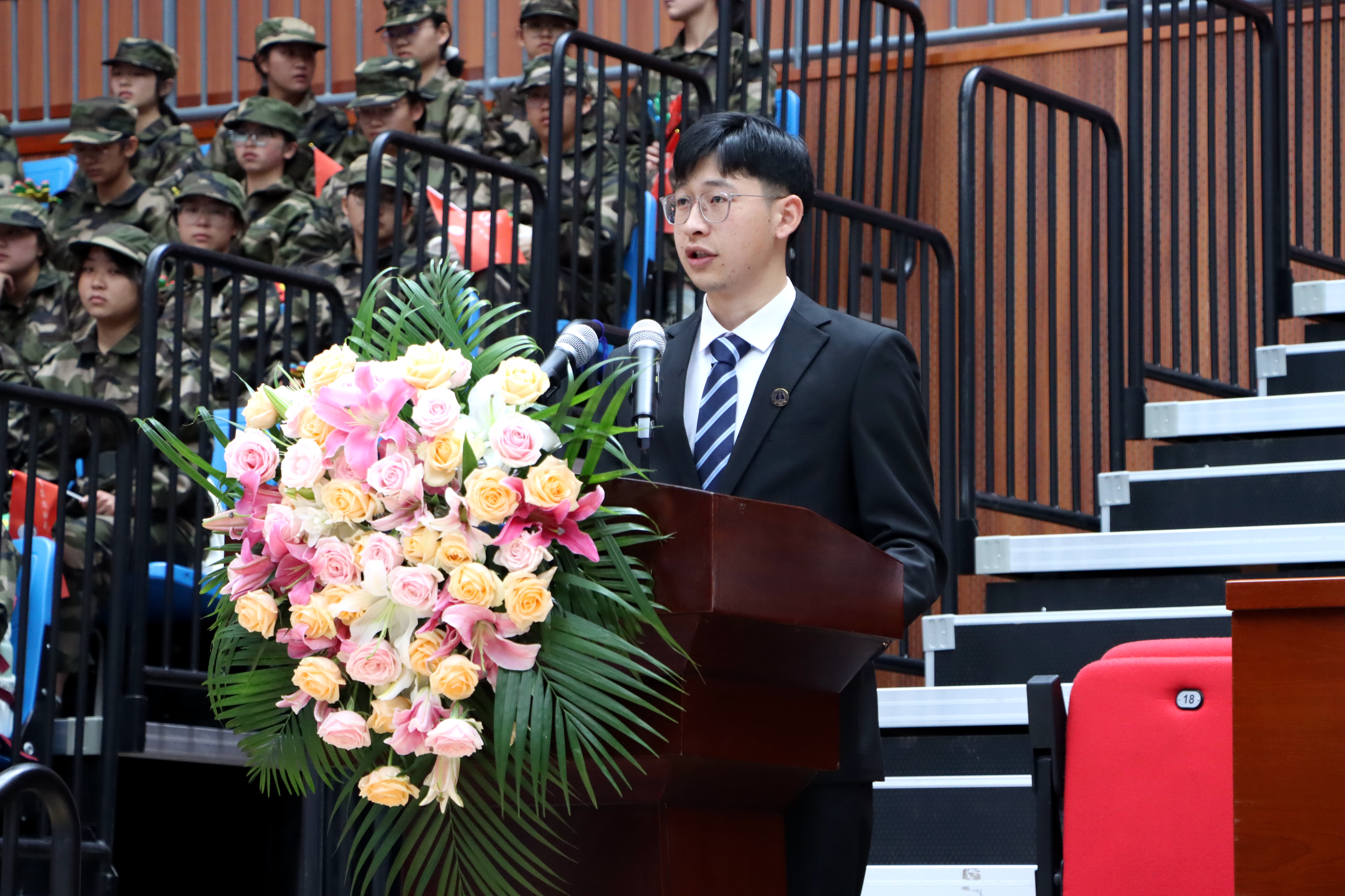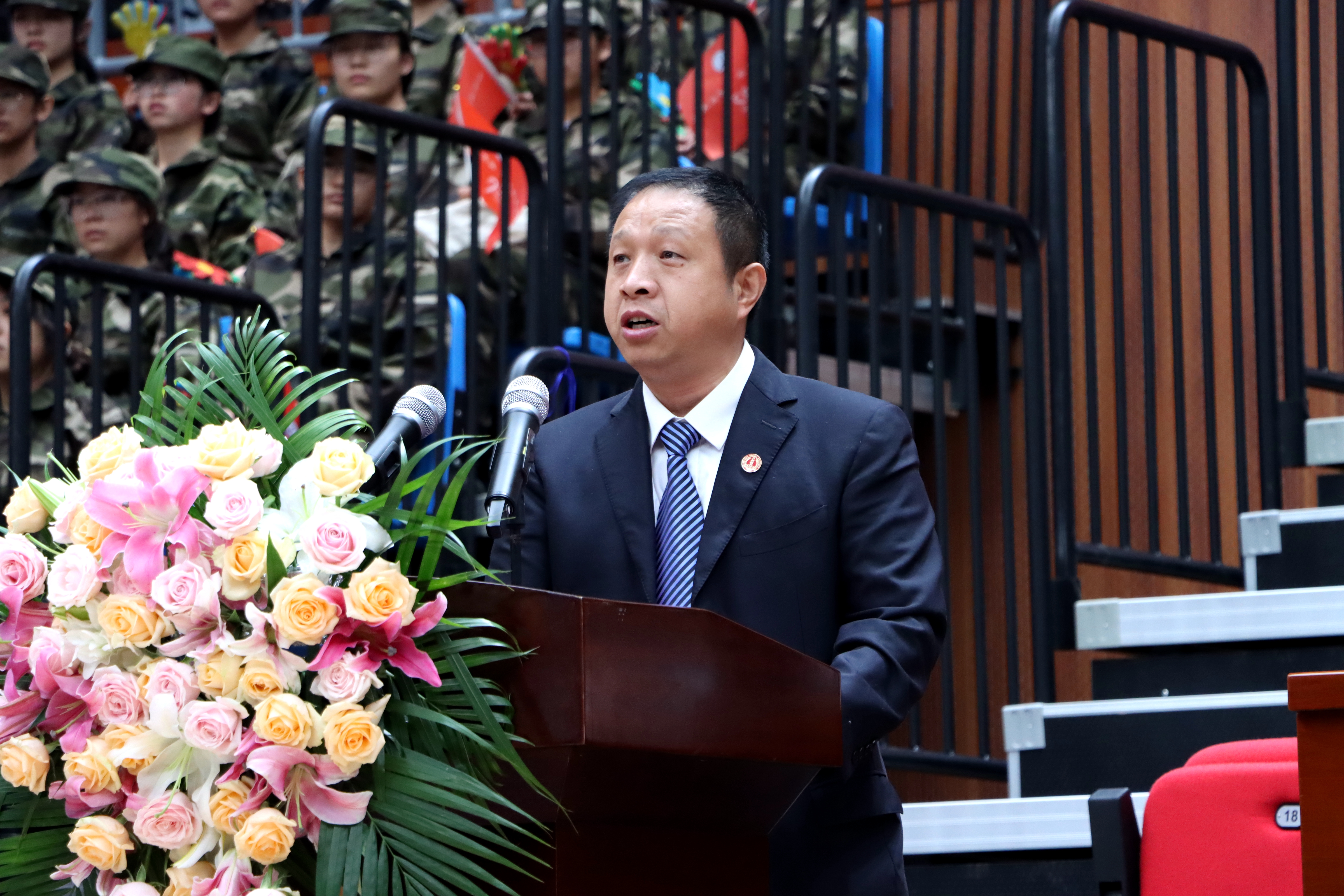 主席台就座的校领导为新生代表佩戴校徽。