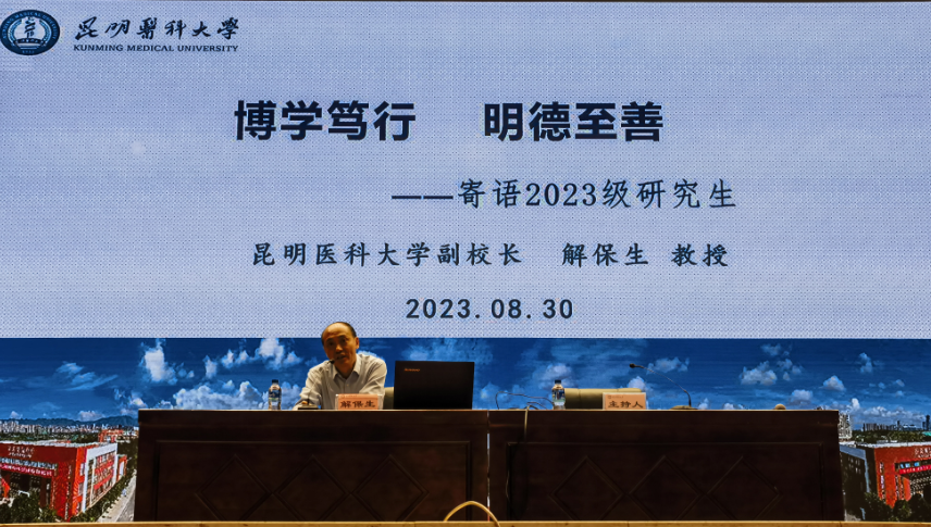 解保生以“博学笃行 明德至善”为题,从昆明医科大学基本情况、学校学位与研究生教育概况、对2023级研究生的建议和希望3个方面,与同学们共同回顾了学校90年发展历程,介绍了学校和学位与研究生教育现状,展望了研究生教育的发展目标,勉励每一位同学苦练本领,励志担当,博学笃行,德技双馨,投身祖国健康事业,努力成长为堪当民族复兴重任的时代新人。