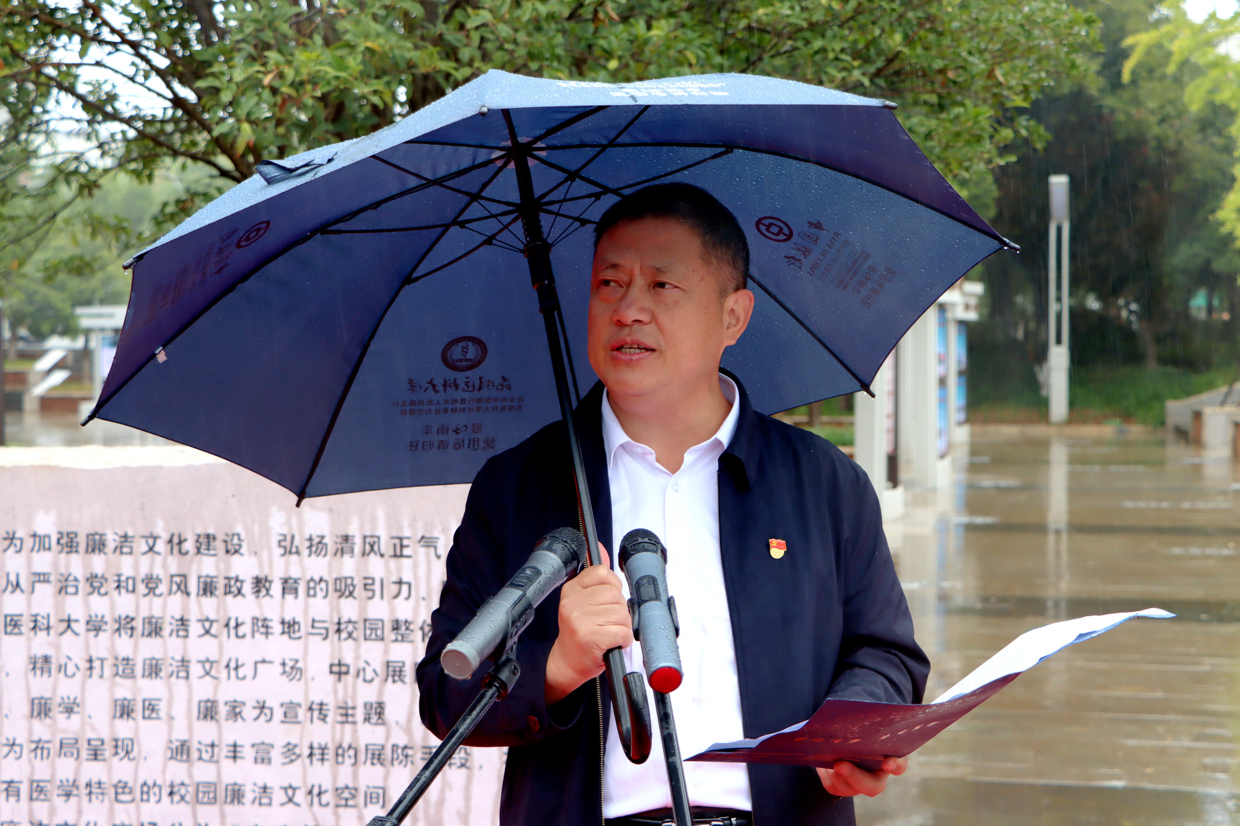 校党委书记尹向阳在揭幕仪式上致辞,向廉洁文化广场建成启用表示祝贺。他指出,学校肩负教育、医疗两大领域职责,必须将廉洁文化建设作为一体推进不敢腐、不能腐、不想腐的基础性工程抓紧抓实抓好,廉洁文化广场正式建成启用为推进“清廉学校”“清廉医院”建设提供了良好的硬件基础和支持,是推动廉洁文化教育由室内向室外拓展、由党员干部向普通师生覆盖的创新之举。各单位、各部门要结合实际开展廉洁文化阵地建设,利用好、整合好各类廉洁文化阵地及教育资源,持续发掘和融合医学文化和廉洁文化元素,构建起广覆盖、多层次、全方位的廉洁文化体系,切实发挥好廉洁教育的基础性作用。希望广大党员干部、教医护职工和学生以此次廉洁文化广场建成启用为契机,以清廉文化启智润心,以高尚道德砥砺品格,着力建设风清气正的校园政治生态,为高水平开放型医科大学建设提供坚强保障。