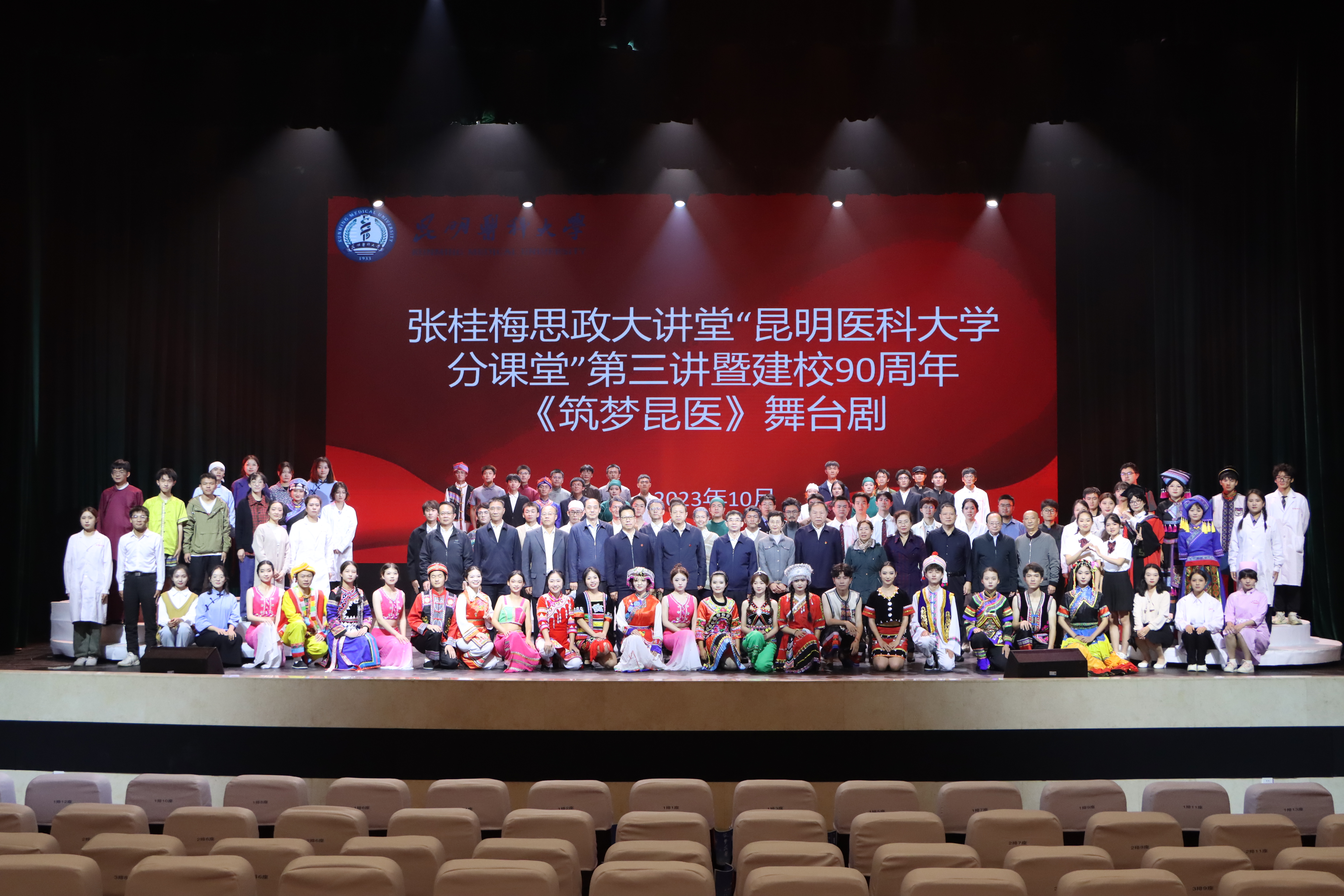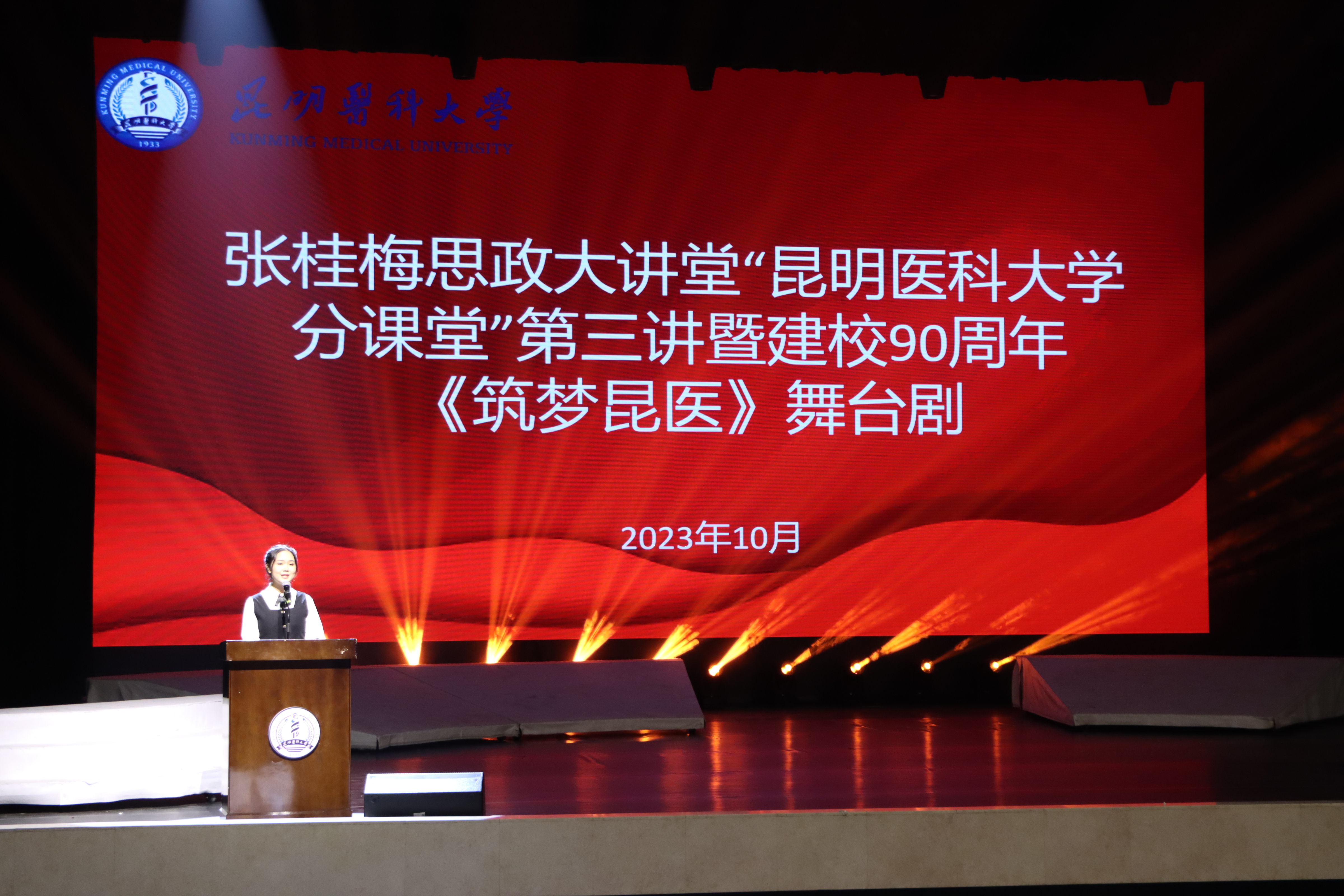 10月15日,“张桂梅思政大讲堂”昆明医科大学分课堂第三讲暨建校90周年《筑梦昆医》舞台剧展演在呈贡校区学生会堂举行。昆明医科大学党政领导、相关部门、学院负责人及千余名师生共同观看了演出。